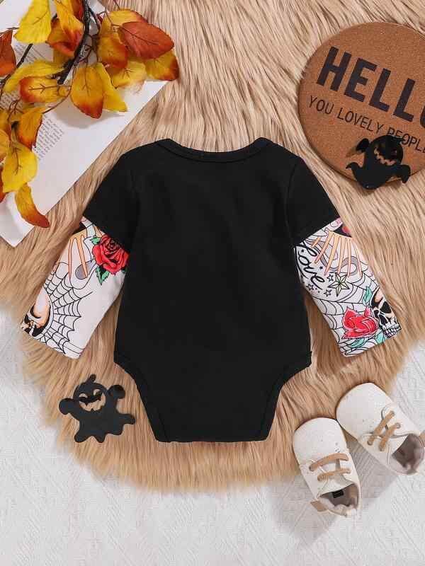 ロンパース ベビー 男の子 女の子 タトゥー風 花柄 袖デザイン 長袖 カバーオール 新生児 乳児 ユニセックス 再生繊維 ポリエステル ブラック 薄手 春夏 普段使い お出かけ