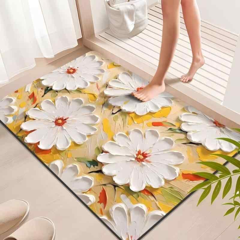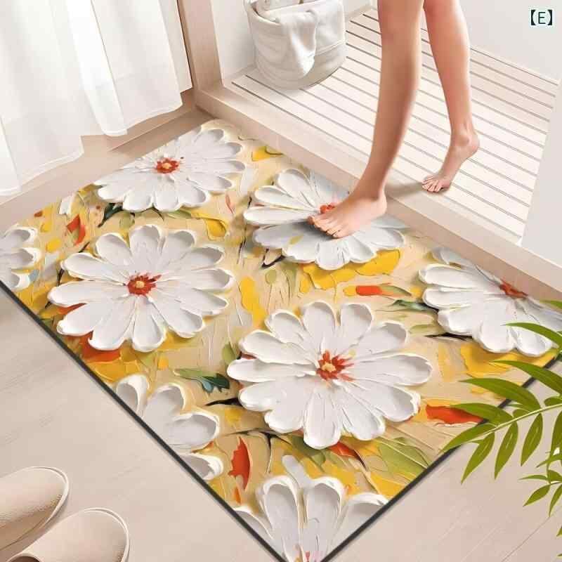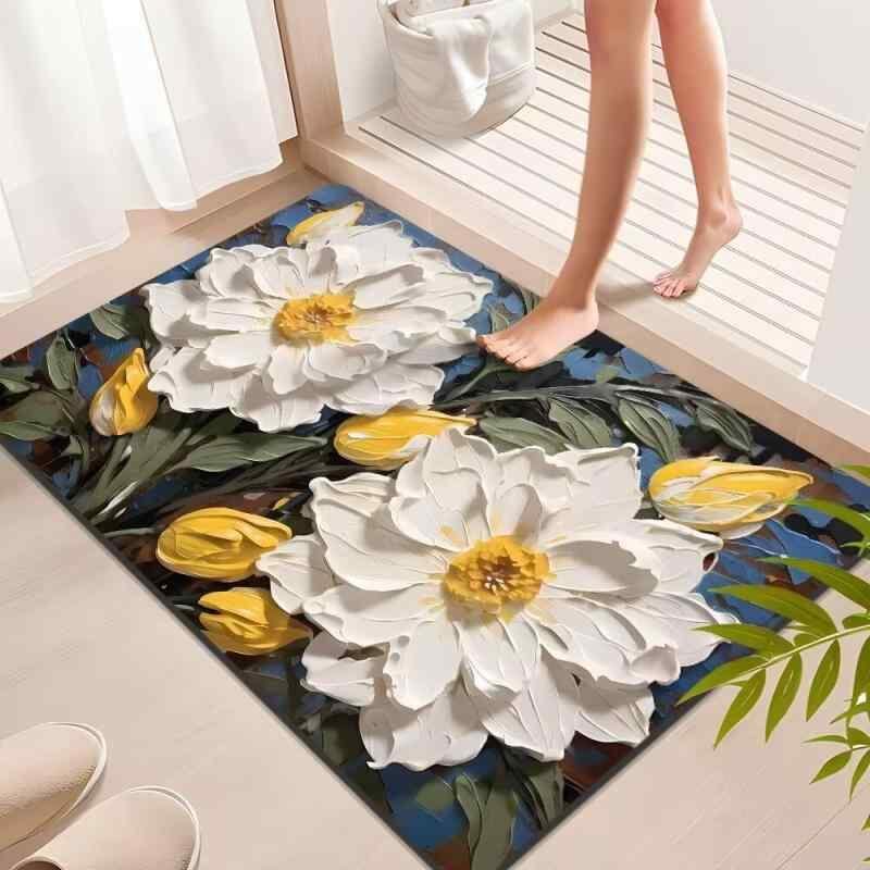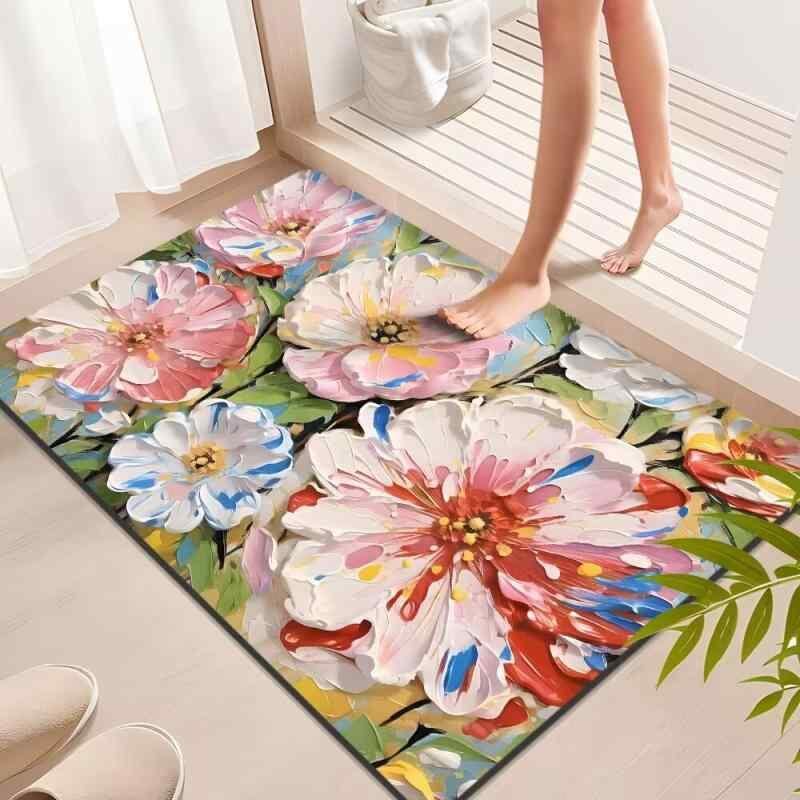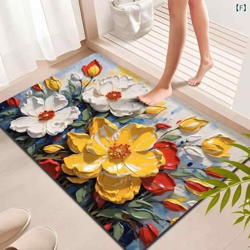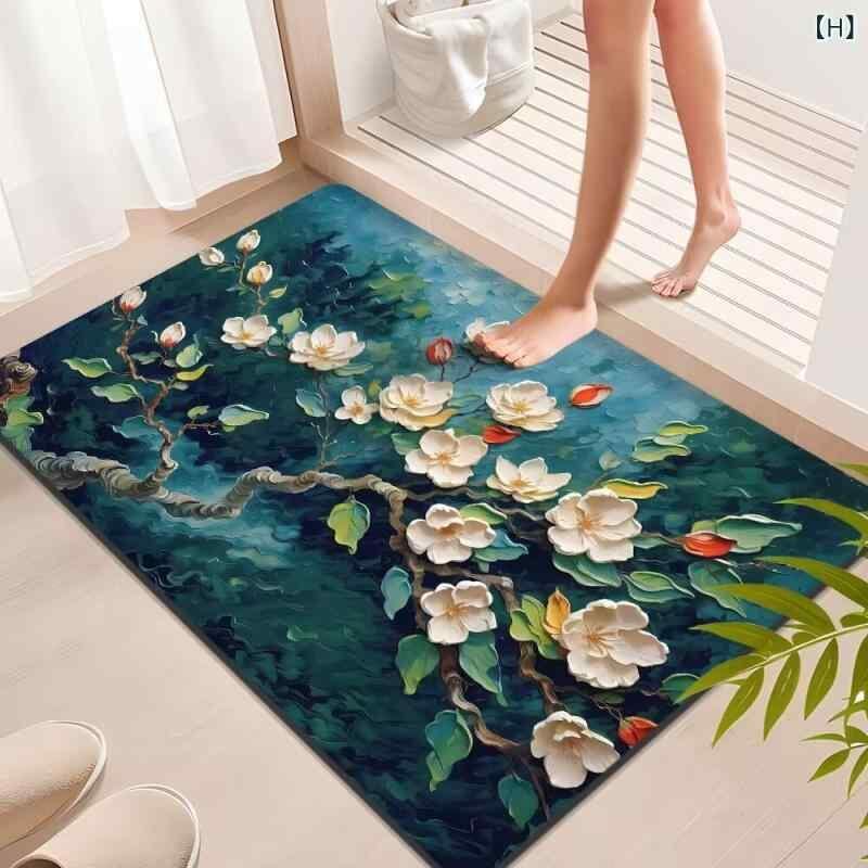 フロアマット 珪藻土製 吸水 速乾 滑り止め 油絵風 立体 植物花柄 玄関 浴室 寝室 リビング対応 ウォッシャブル 耐久性 耐汚性 スクエア 新中華風
