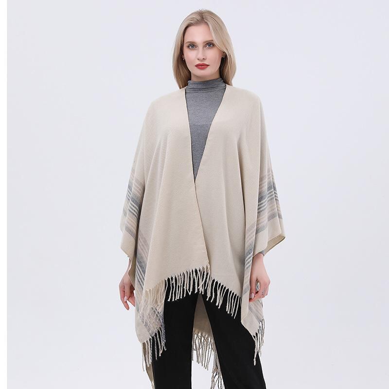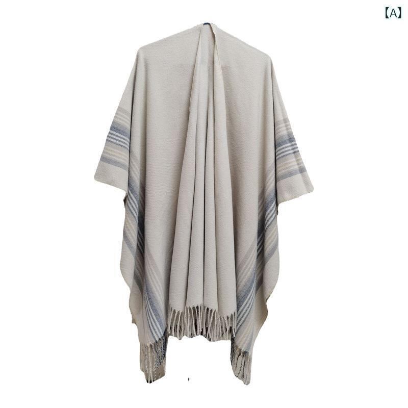ショール ポンチョ ユニセックス 男女兼用 欧米風シンプル おしゃれ フリンジ付き スリット入り 中長丈 ポリエステル起毛 ストライプ柄 秋冬 保温 防寒 体型カバー ゆったり カジュアル お出かけ 多色展開