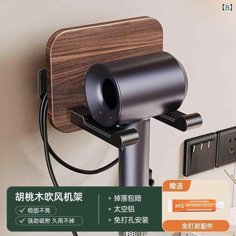 収納ラック 高級感 ウォールナット材 アルミ製 ヘアドライヤースタンド トイレットペーパーホルダー 穴開け不要 壁掛け 洗面所 バスルーム用 ブラック