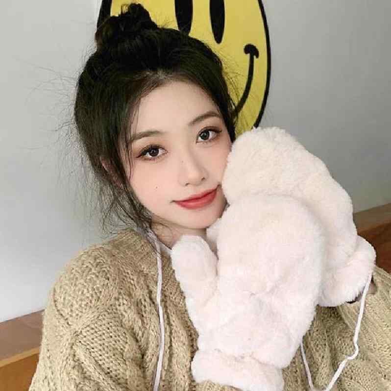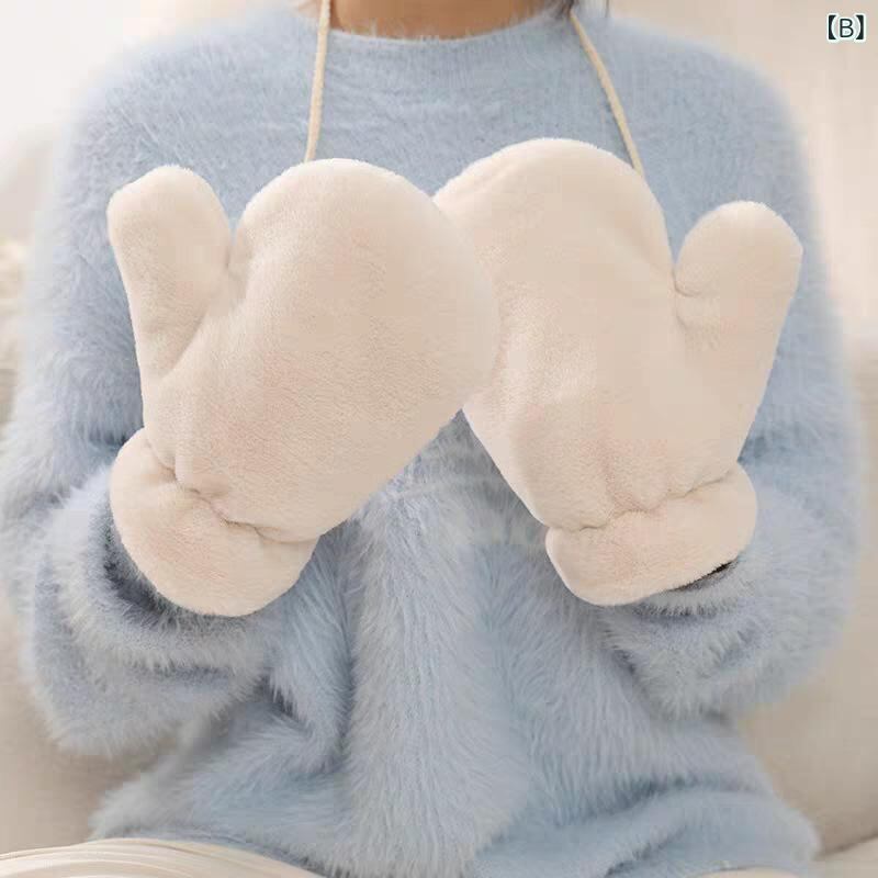 手袋 レディース ミトン グローブ 無地 シンプル ラビットファー 裏起毛 厚手 暖かい 防寒 防風 首掛け ネックストラップ サイクリング 通学 学生 普段使い 秋冬