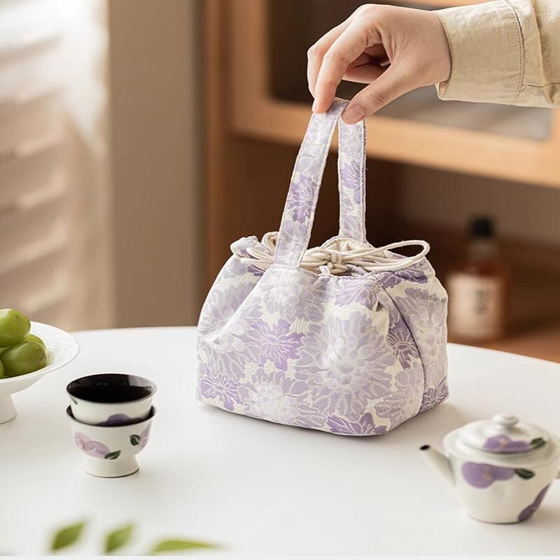 茶器収納ポーチ 綿麻 コットンリネン素材 トラベル 旅行 携帯用 持ち運び お出かけ ティーセット 簡易茶器 マイカップ おしゃれ かわいい コンパクト 軽量 紫色