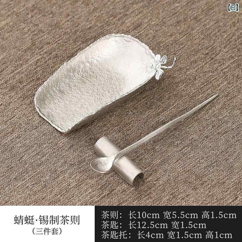 ["・カテゴリ: 茶道アクセサリー","・素材: 錫","・種類: 錫茶則【蓮弁】3点セット、錫茶則【蜻蛉】3点セット、錫茶則【臘梅】3点セット、錫茶則【巻心】2点セット","・スタイル: ライトラグジュアリー","・カラー: 錫"]