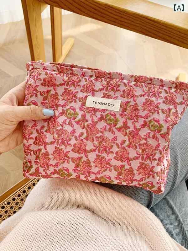 コスメポーチ レディース 女性用 レトロ ヴィンテージ 花柄 フラワー ダークレッド ジャカード織り クラッチバッグ ハンドポーチ ファスナー付き スクエア型 収納 デイリーユース 普段使い かわいい ポリエステル 春夏