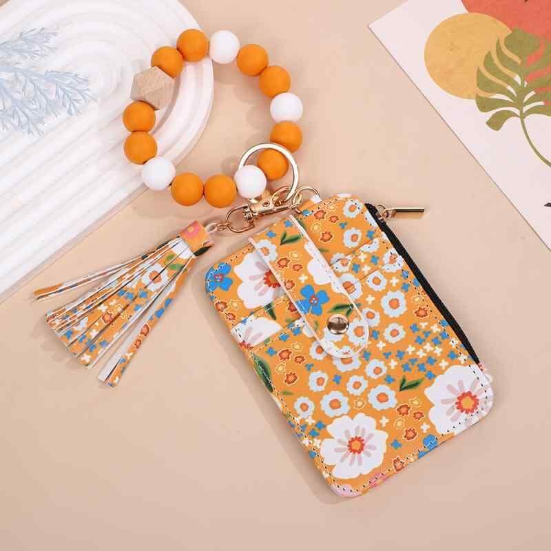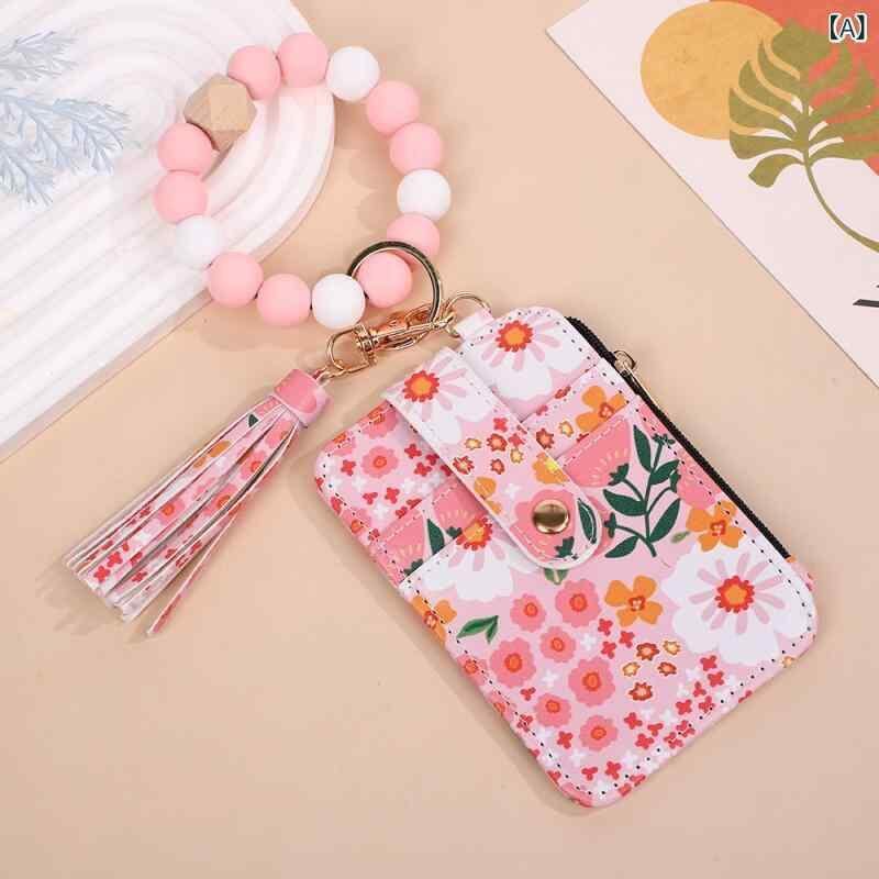 キーホルダー レディース シリコンブレスレット付き カードケース 小銭入れ 多機能 花柄プリント PUレザー コンパクト ミニ財布 かわいい ファッション雑貨 通勤 日常使い