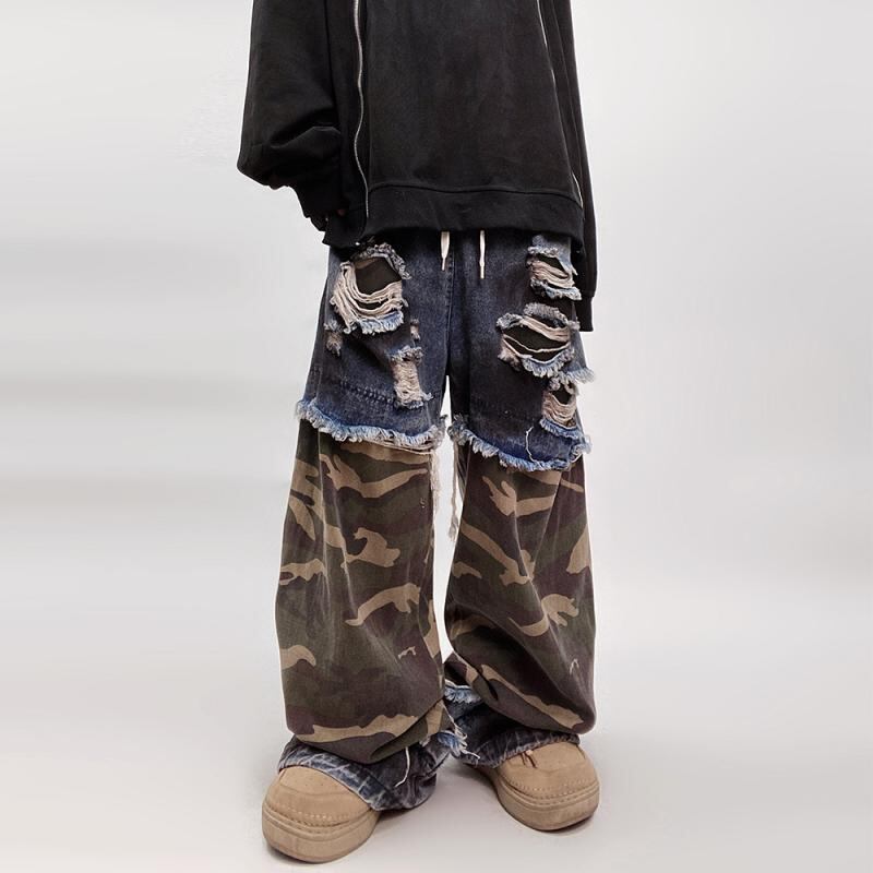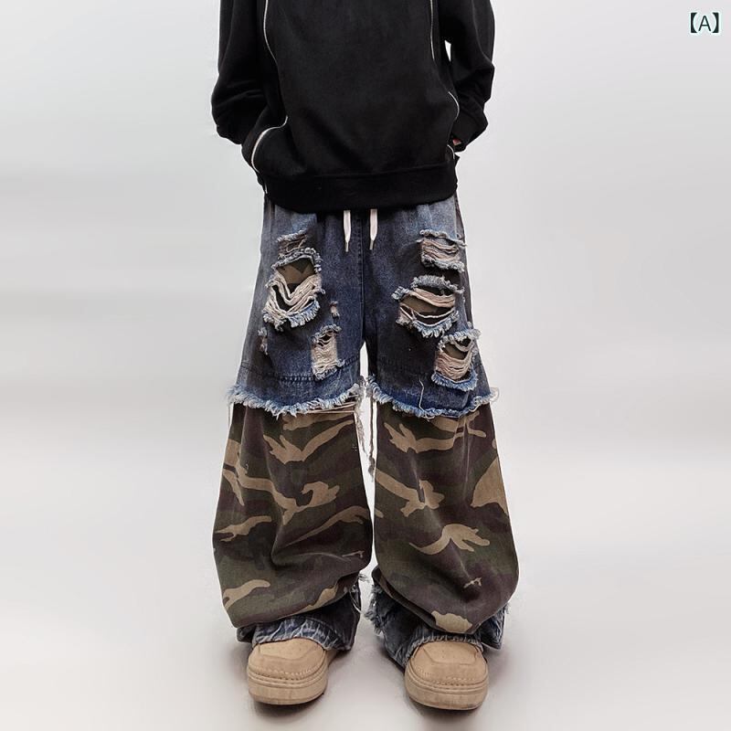 デニムパンツ メンズ ストリート ヒップホップ レトロ ヴィンテージ 迷彩柄 ダメージ加工 クラッシュ加工 ワイド ルーズ フルレングス コットン ストレッチ ボトムス