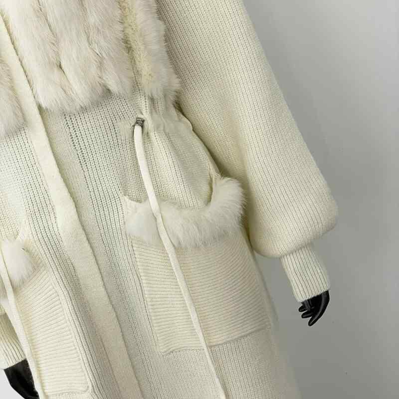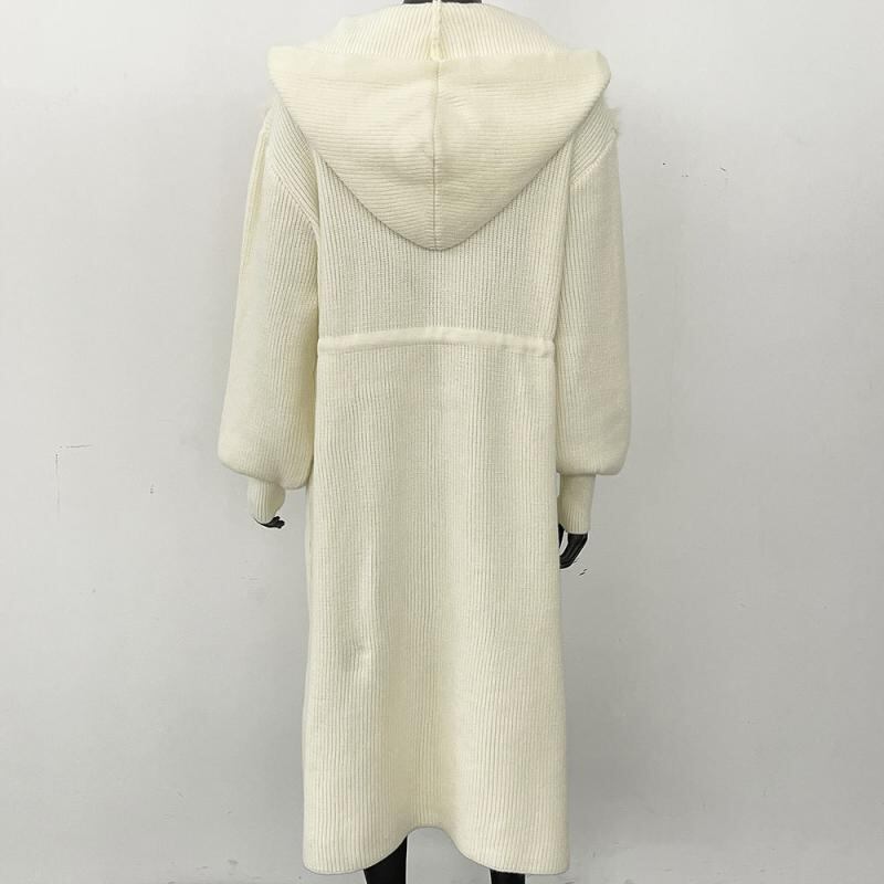 ニット カーディガン レディース フォックスファー 高級感 上品 オフホワイト 秋冬 ゆったり 着痩せ ロング丈 フード付き ファスナー 長袖 ポケット アウター 羽織り