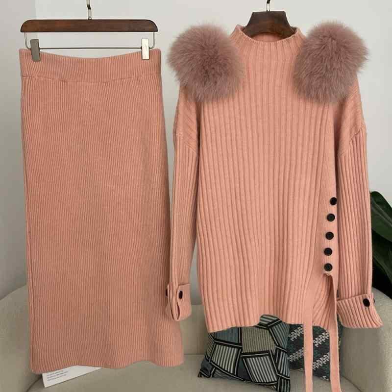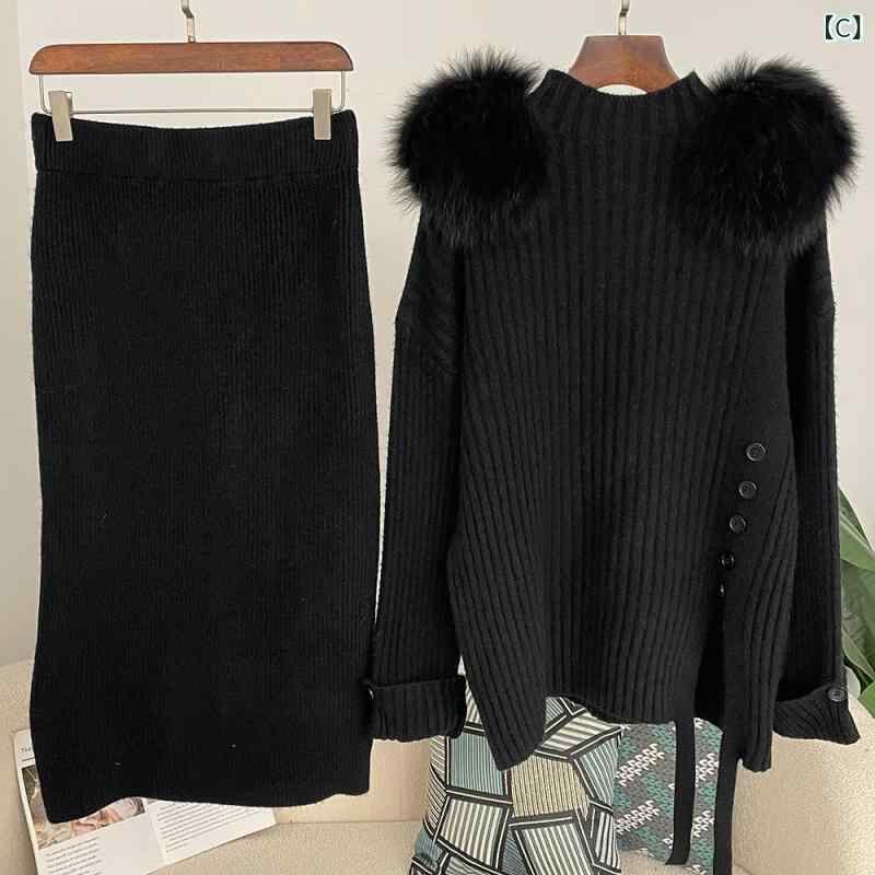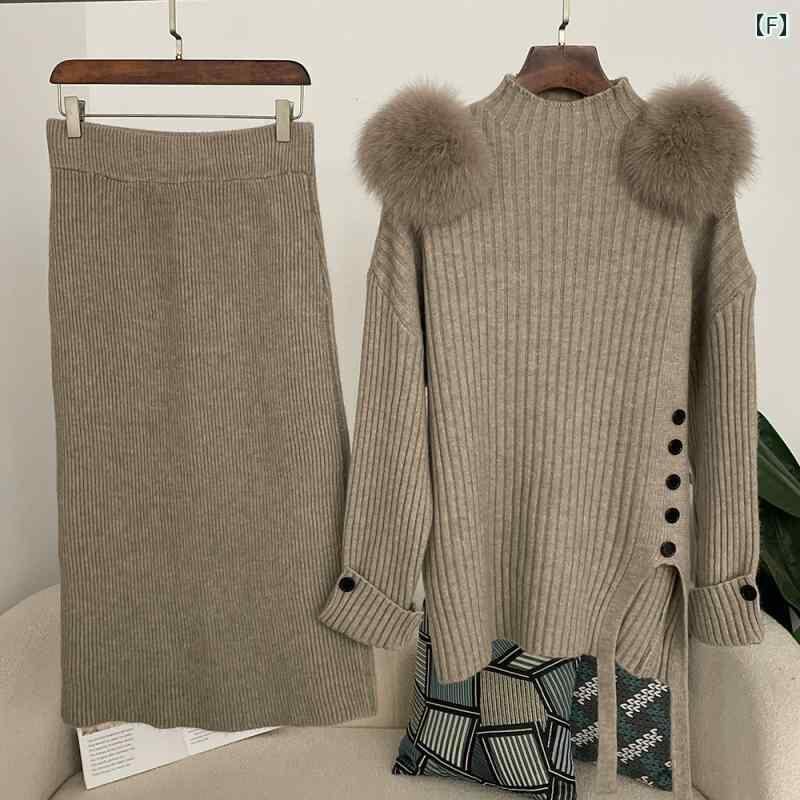 セットアップ レディース ハイネック ニット セーター 肩ファーデザイン ひざ丈 タイトスカート スリット入り 春 エレガント 通勤 オフィスカジュアル 上品 2点セット 着回し
