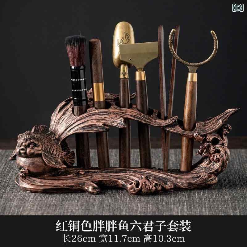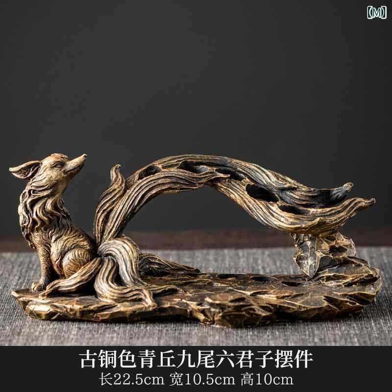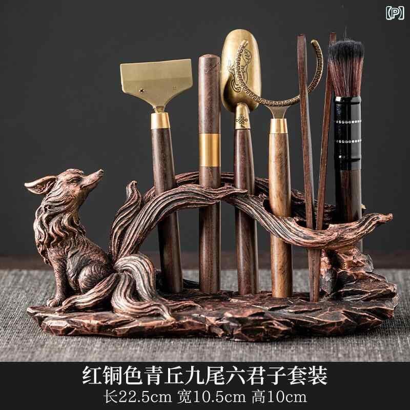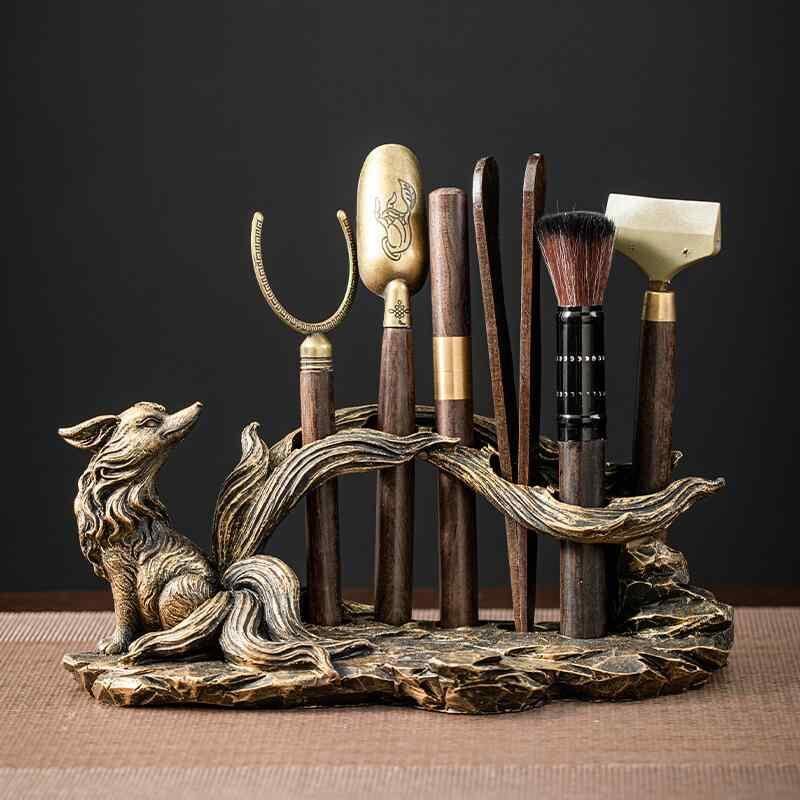 茶道具 六君子セット 家庭用 自宅用 中華風 樹脂製 九尾狐 茶台 オブジェ 置物 スマホスタンド機能付き デスクオーガナイザー 縁起物 ブロンズカラー プレゼント ギフト