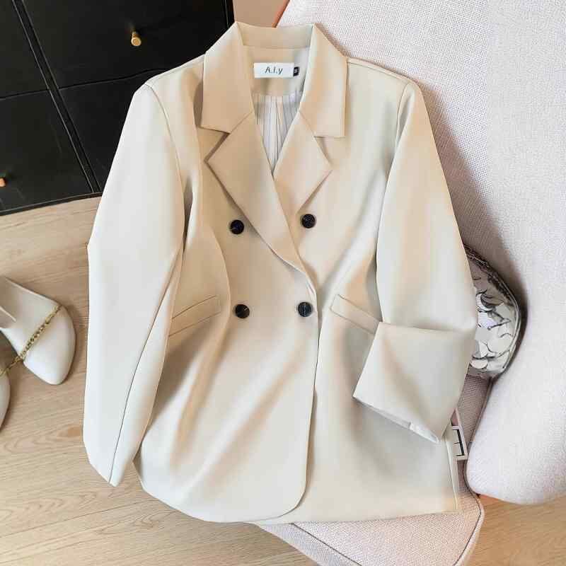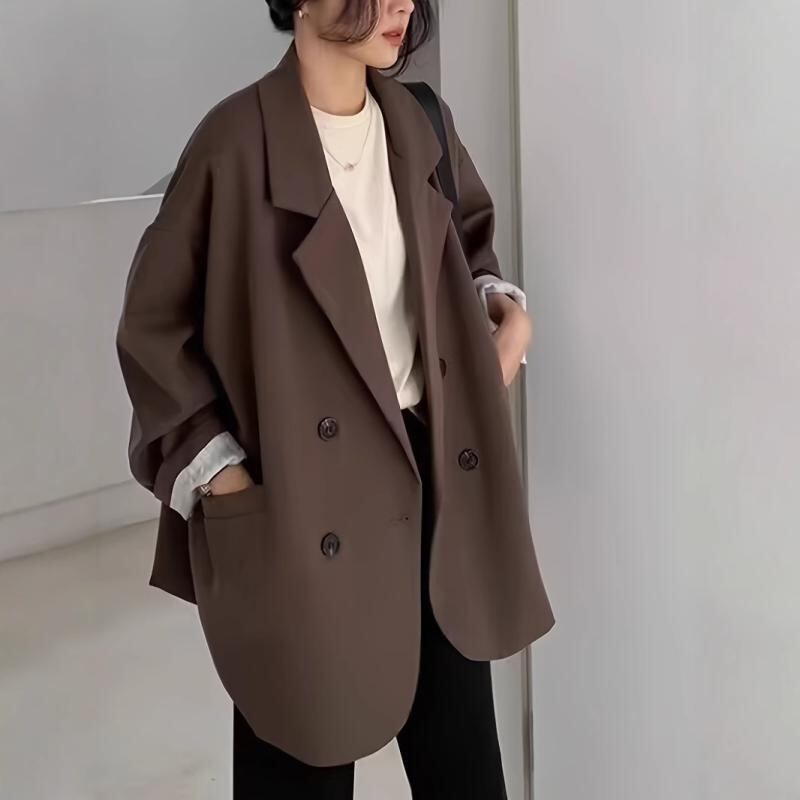 テーラードジャケット レディース 春秋 リラックス カジュアル ゆったり オーバーサイズ 体型カバー 無地 長袖 ミドル丈 ダブルボタン コーヒーブラウン ポリエステル ブレザー 通勤 オフィス