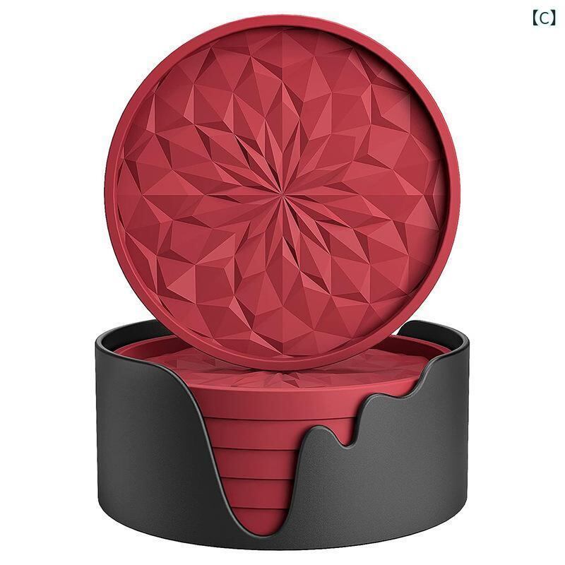 コースター シリコン 6個セット 台座付き ドリンク ワイングラス用 厚手 滑り止め 菱形 ノンスティック トレー ブラック グレー レッド 無地 モダン おしゃれ 来客用