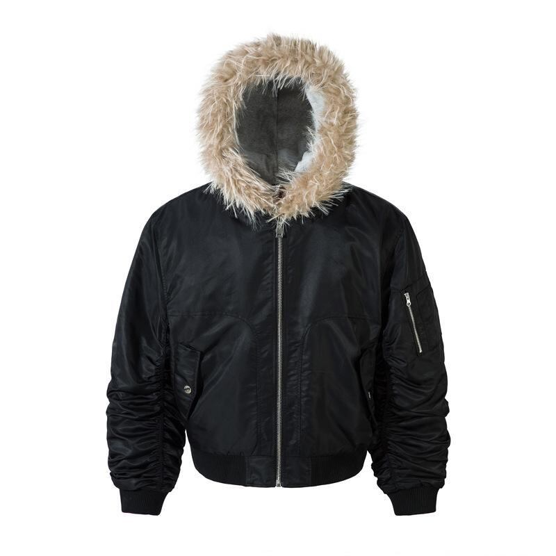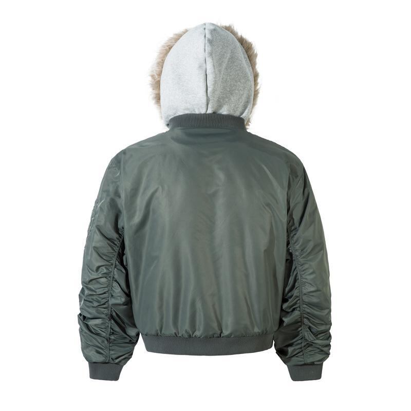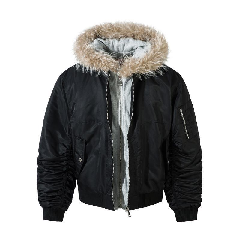 中綿ジャケット 男性用 冬 ファー襟 フード付き フェイクレイヤード 切り替え アメリカンデザイン ストリート カジュアル ルーズフィット 迷彩柄 ポリエステル 防寒 アウター ブルゾン