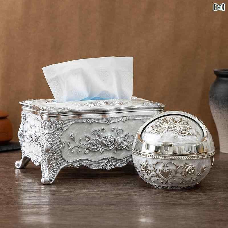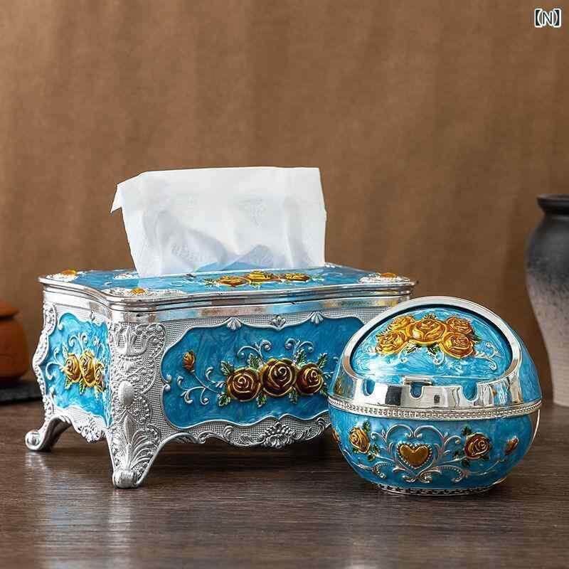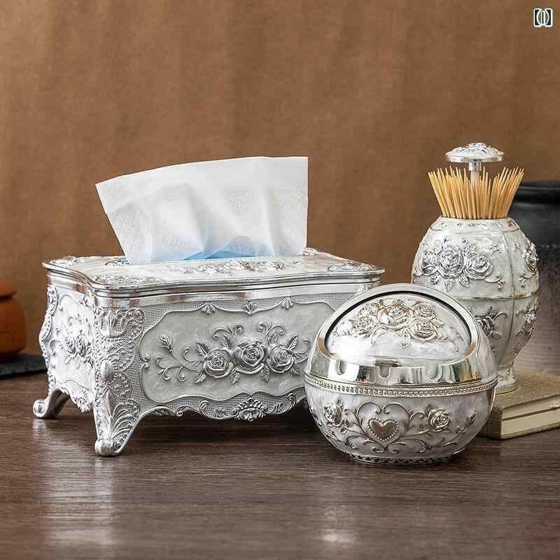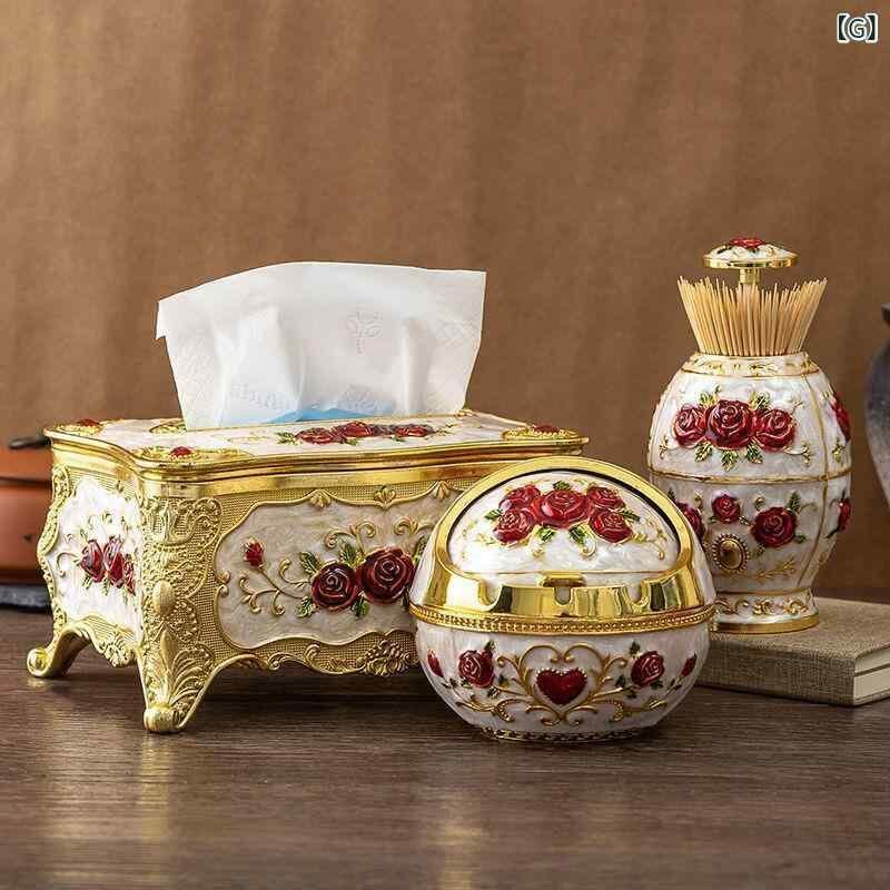 ティッシュケース 灰皿 つまようじ入れ 3点セット ヨーロピアン調 おしゃれ 家庭用 リビング 卓上 収納ボックス インテリア雑貨 樹脂製 防水 高級感 ゴールド シルバー