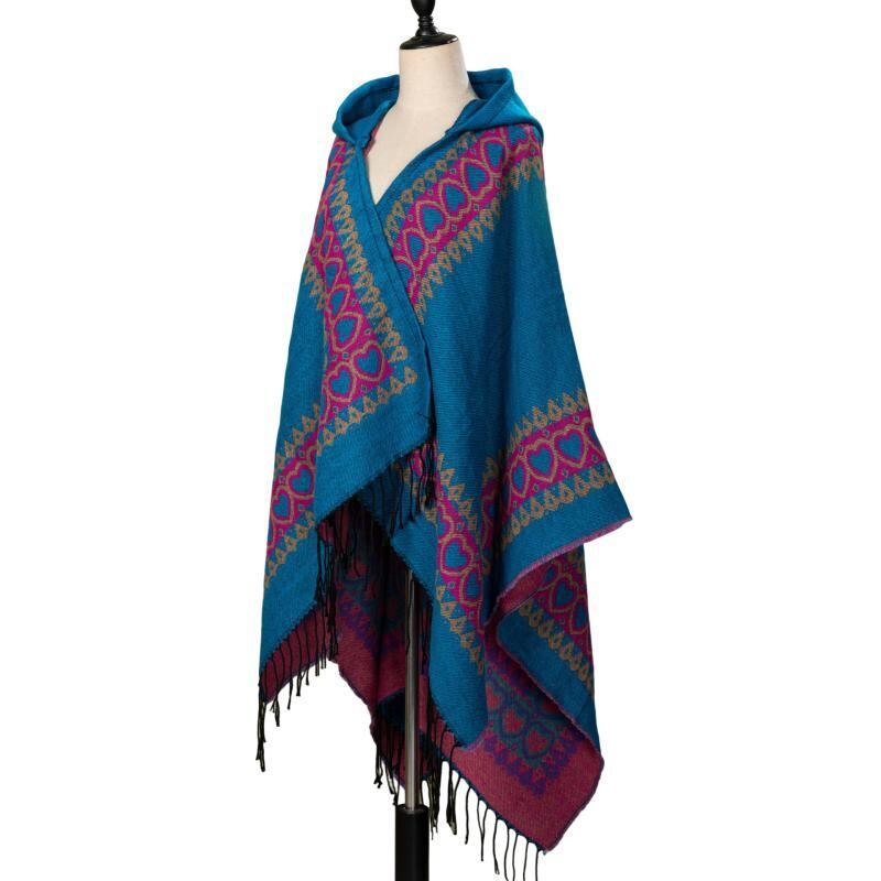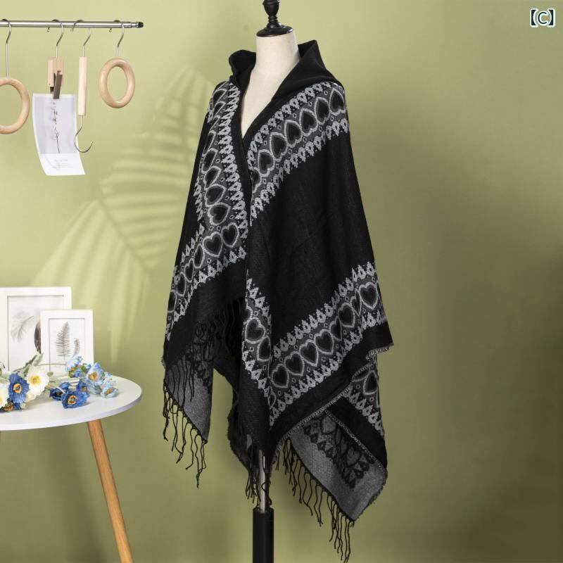 ショール レディース 民族風 エスニック レトロ フード付き フリンジ ハート 幾何学模様 防寒 暖か 保温 旅行 レジャー お出かけ 撮影 羽織り ポリエステル アクリル混 レッド ブルー ブラック オレンジ