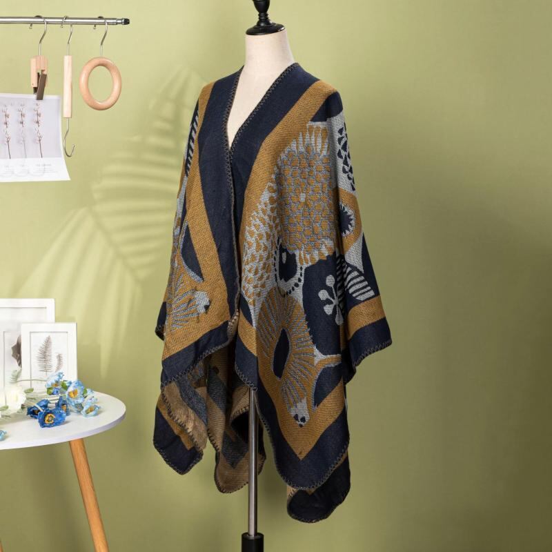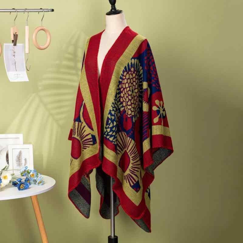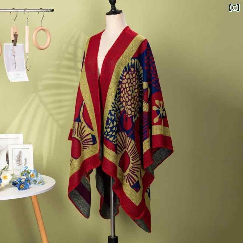 ショール レディース 民族調 レトロ 花柄 プリント ポンチョ ケープ ストール 大判 ポリエステル アクリル 保温 防寒 暖か 快適 カジュアル アウトドア 旅行 羽織り
