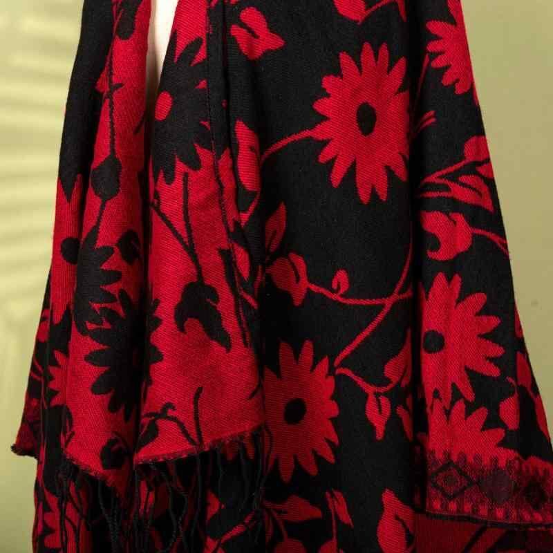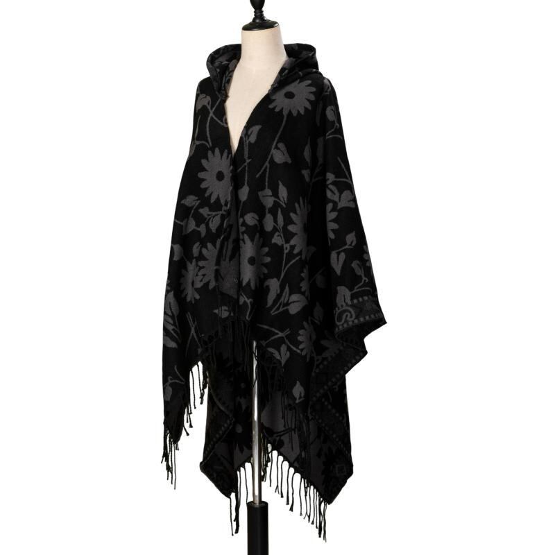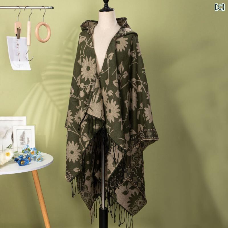 ポンチョ 男女兼用 レトロ 民族柄 エスニック 花柄 フード付き ケープ ショール マント ストール 多機能 保温 あったか ポリエステル アクリル 旅行 アウトドア 普段使い レッド ブラウン オリーブ ブラック