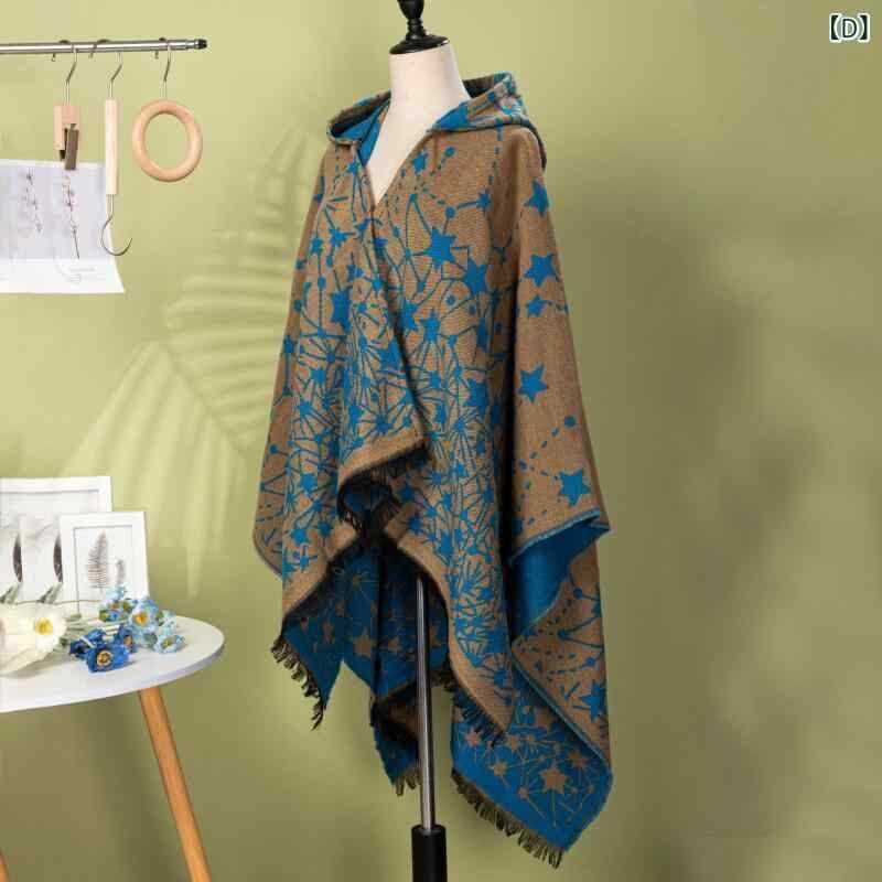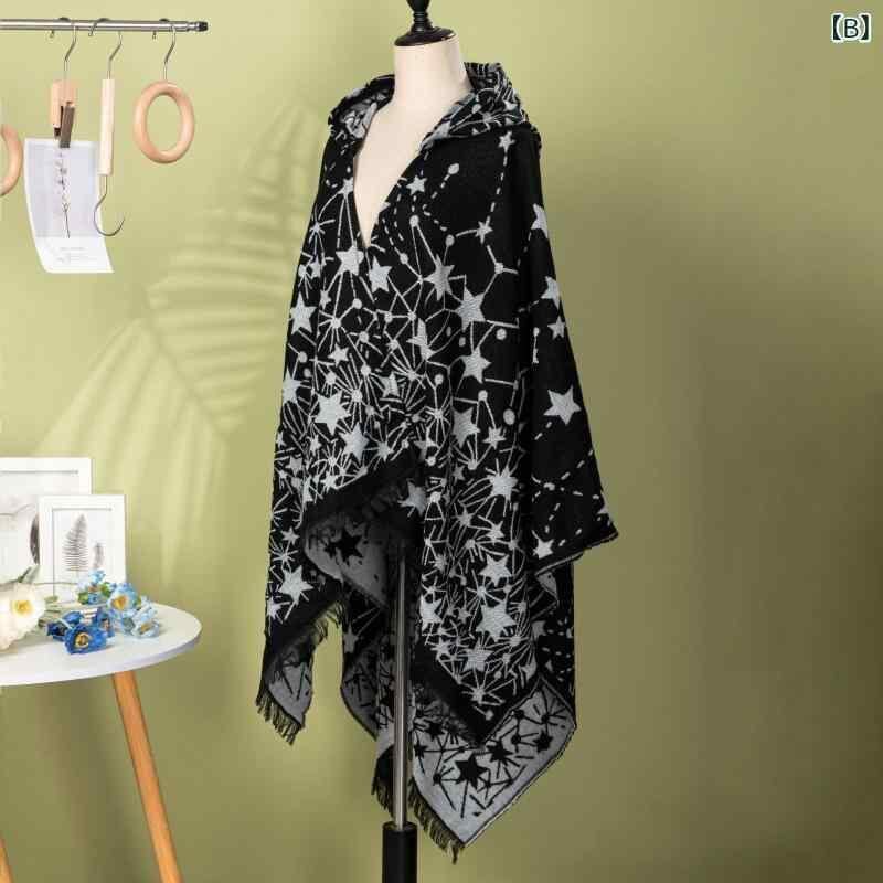 ショール レディース 女性用 フード付き 保温 防寒 ケープ ポンチョ ショートフリンジ スター柄 大判 羽織り アウター レトロ 民族風 ポリエステル アクリル
