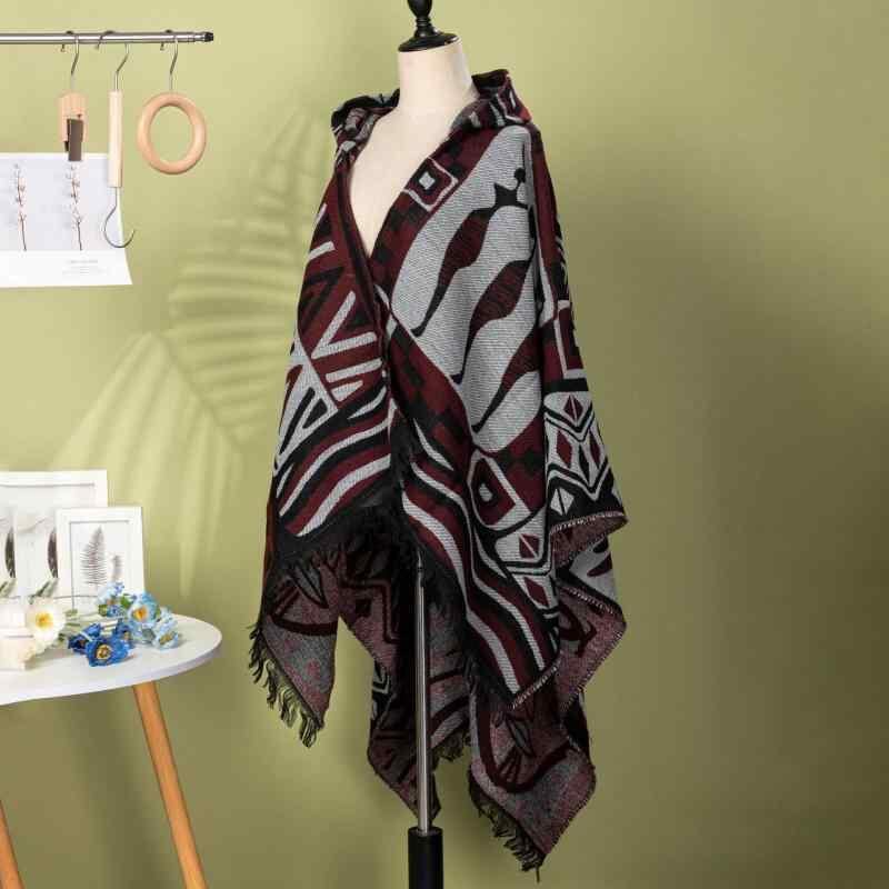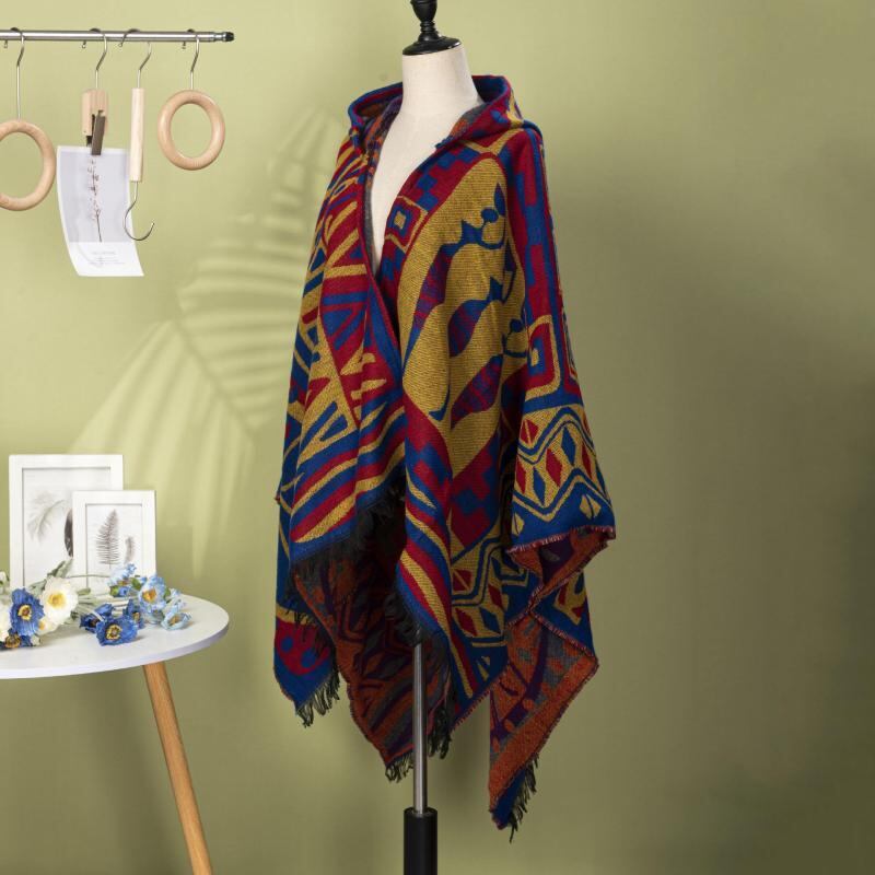 ポンチョ 男女兼用 ユニセックス レトロ 幾何学柄 配色 切り替え ショート フリンジ フード付き アウトドア 防寒 保温 羽織り アウター ショール ケープ ポリエステル アクリル オーバーサイズ 普段使い お出かけ ディープレッド レッド系 ブルー系