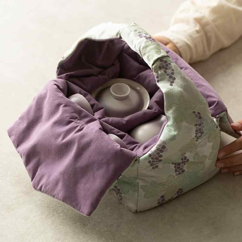 茶器ケース 織り綿 コットン 布製 携帯用 ポータブル 茶道具 収納バッグ ポーチ アウトドア 旅行 レジャー 高級感 中華風 ティーセット ぶどう色