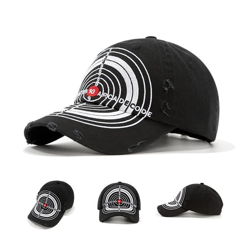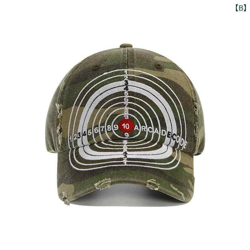 キャップ 男女兼用 アメカジ ストリート ヒップホップ 個性的 迷彩 ターゲットデザイン 重厚感 ダメージ加工 深め ビッグサイズ UVカット 紫外線対策 日よけ 通気性 コットン 黒