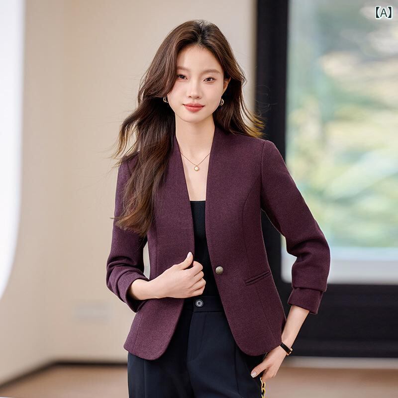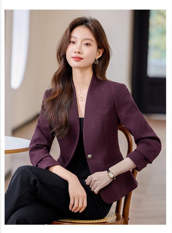 ノーカラージャケット レディース 紫色 ショート丈 低身長向け カジュアル きれいめ オフィス 通勤 ビジネス 秋冬 高級感 上着 ポリエステル