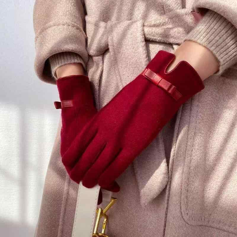 手袋 レディース 羊毛 カシミヤ 五本指 裏起毛 厚手 防風 保温 あったか サイクリング バイク 通勤 普段使い かわいい エレガント 上品 リボン 冬 カーキ グレー