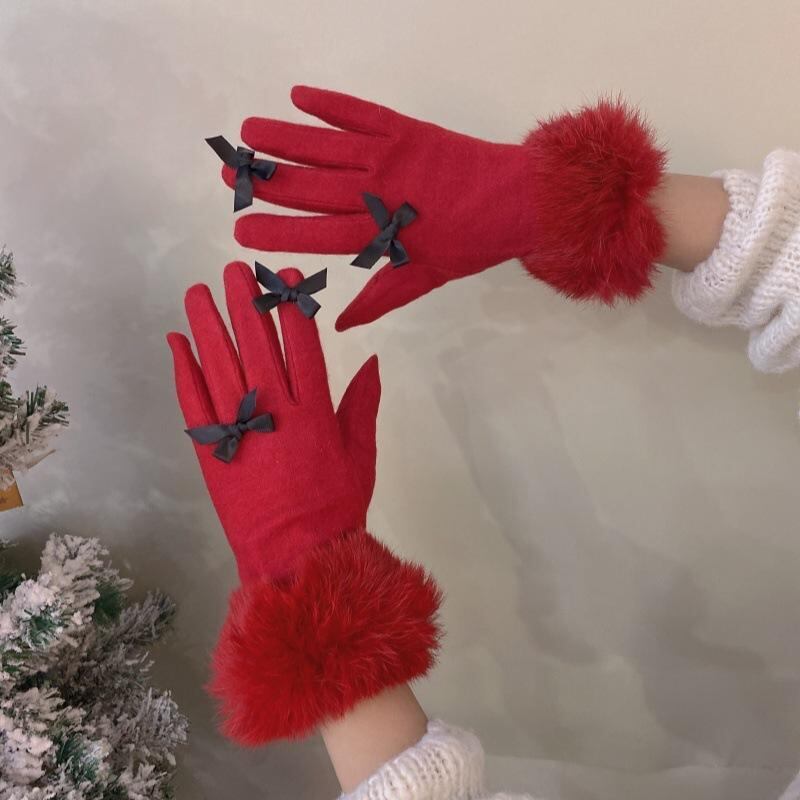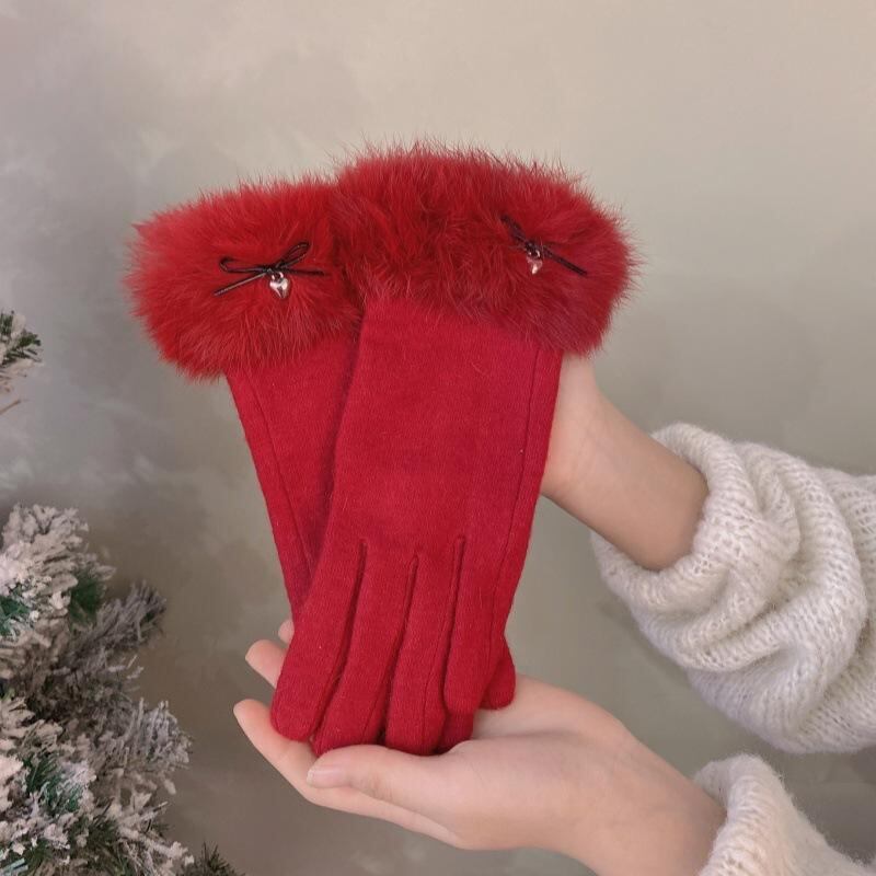 手袋 レディース グローブ 冬 防寒 保温 暖かい かわいい フェミニン 厚手 裏起毛 ふわふわ もこもこ 五本指 カシミヤ アンゴララビットファー レッド ピンク