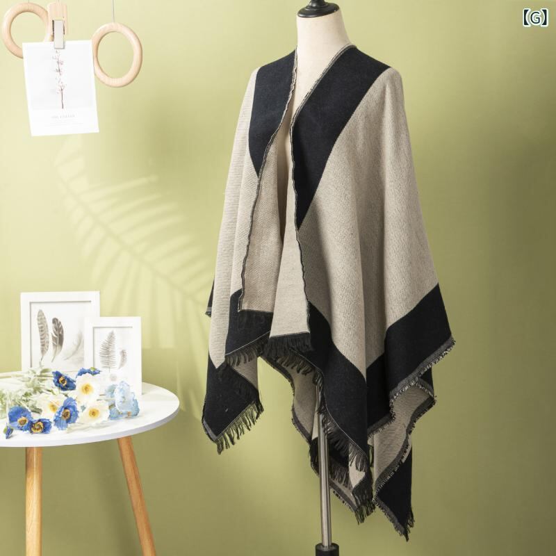 ストール レディース 女性用 民族柄 エスニック フリンジ 厚手 保温 防寒 ポンチョ ケープ 羽織り 2色切り替え 秋冬 フェイクカシミヤ カシミヤ調 カジュアル ファッション