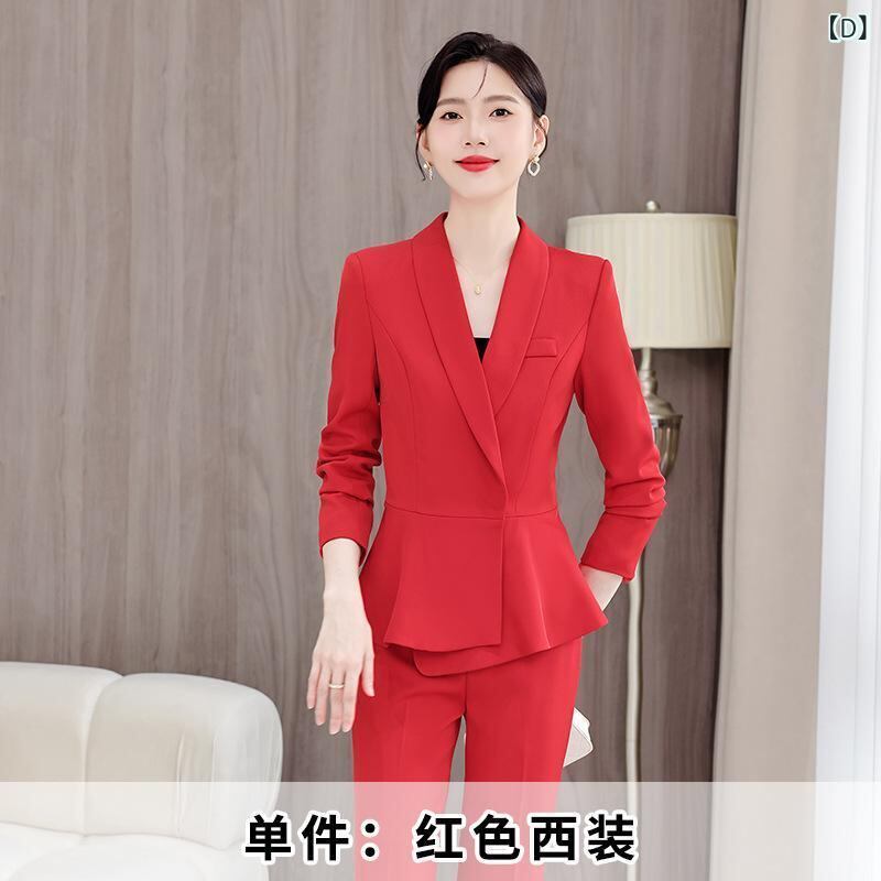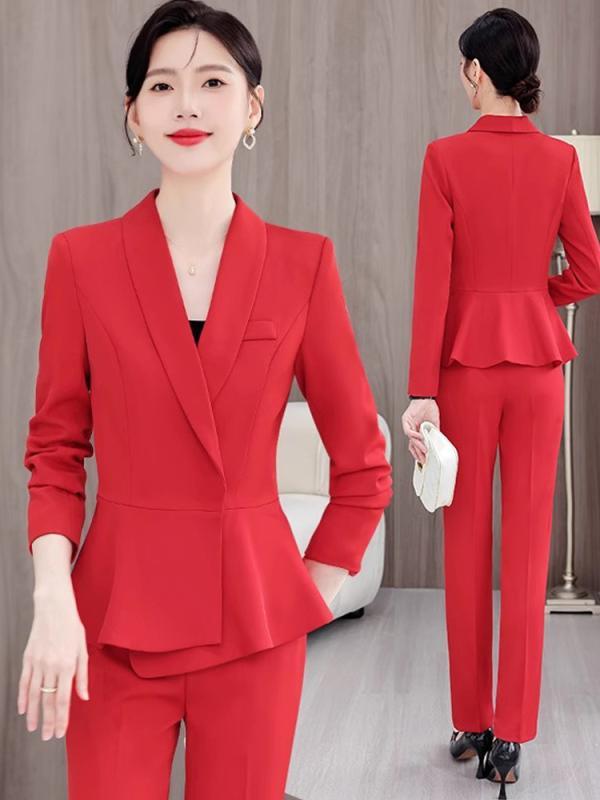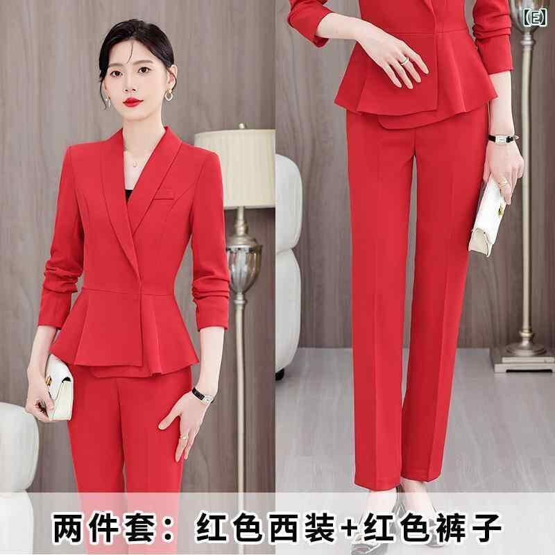 スーツ レディース レッド 赤 春秋 ビジネス オフィス 通勤 フォーマル 接客 受付 ホテルユニフォーム セットアップ ジャケット 無地 長袖 ポリエステル ストレートシルエット ポケット エレガント