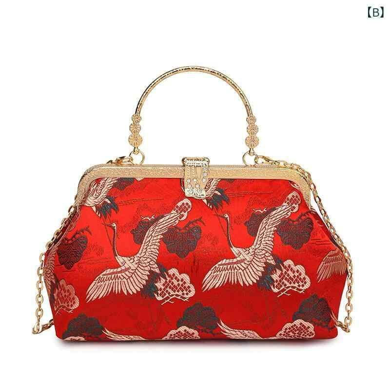 バッグ レディース チャイナ風 鶴 刺繍 がま口 シェル型 レトロ エレガント クラシック 斜め掛け 手提げ 絹 チェーン付き デイリーユース ブラック レッド シルバー ゴールド