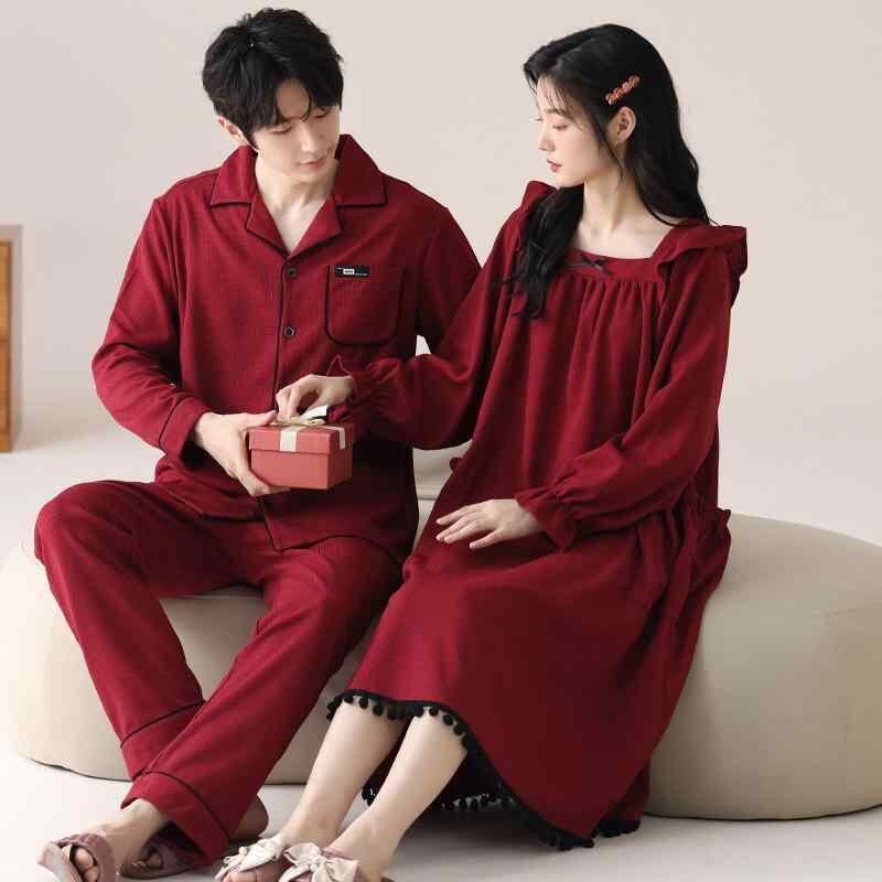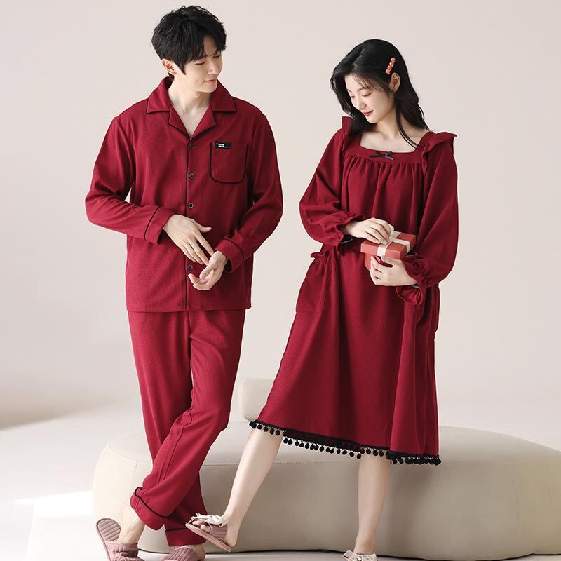ルームウェア パジャマ カップル ペア セット 赤 レッド 結婚祝い 新婚祝い 綿100% コットン 長袖 長ズボン 丸首 春秋 冬 通年 高級感 リラックス 通気性 快適 保温 ストレッチ 部屋着