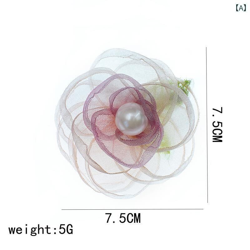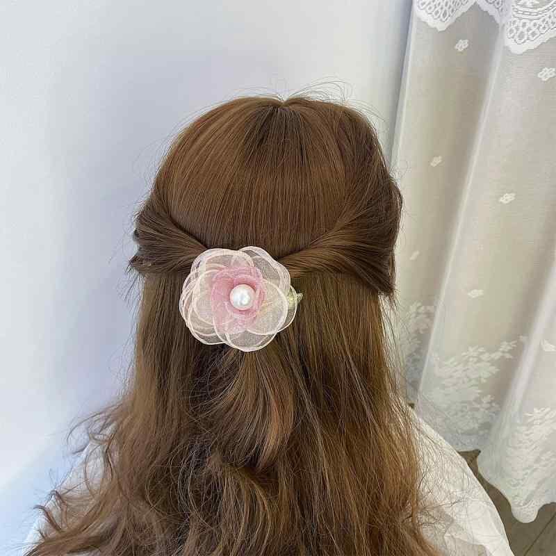 ヘアクリップ レディース ピンク パール カメリア 花 オーガンジー チュール まとめ髪 編み込み 後頭部用 普段使い デイリー パーティー 結婚式 髪飾り エレガント 上品 かわいい 手作り