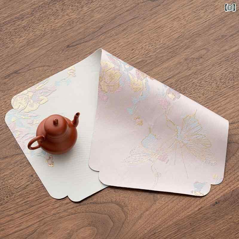茶席 乾式 中国風 浮き彫り エンボス加工 金織り 両面 リバーシブル 手作り ハンドメイド 布製 ファブリック テーブルマット プレイスマット ティーポットマット コースター 山水 鶴 蝶柄