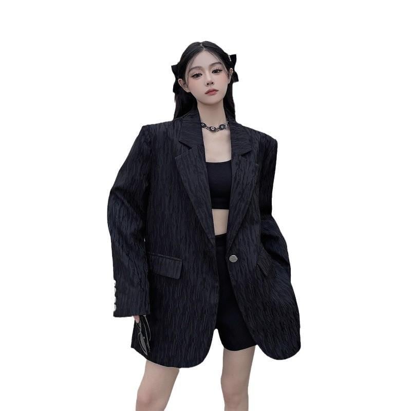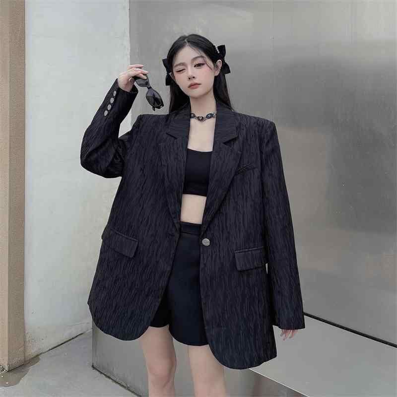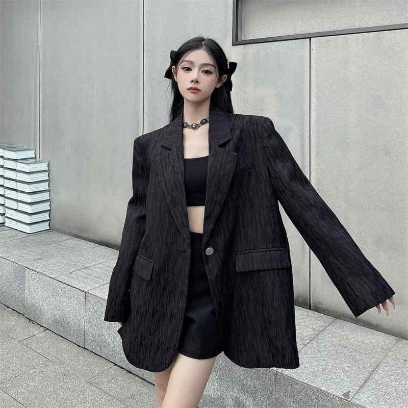 テーラードジャケット レディース 韓国ファッション 高級感 テクスチャー感 無地 長袖 ひとつボタン オーバーサイズ 黒 ポリエステル 春秋 通勤 オフィス カジュアル 着回し