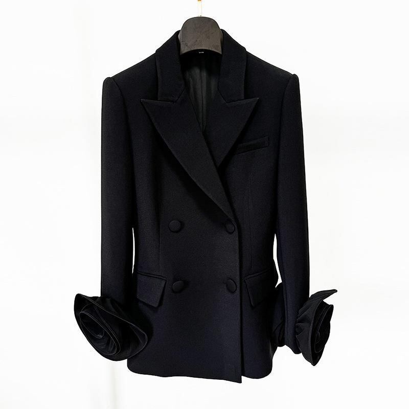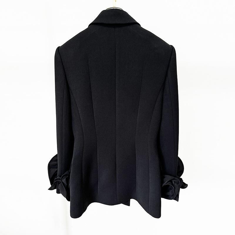 テーラードジャケット レディース ダブルブレスト スリムフィット ロング丈 袖 立体花飾り フラワーモチーフ 通勤 オフィス ビジネス フォーマル きれいめ 上品 秋冬 ポリエステル 綿混 ブラック