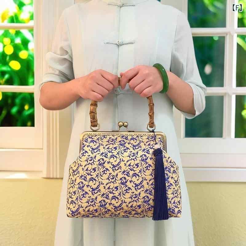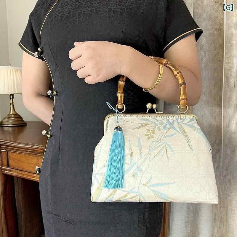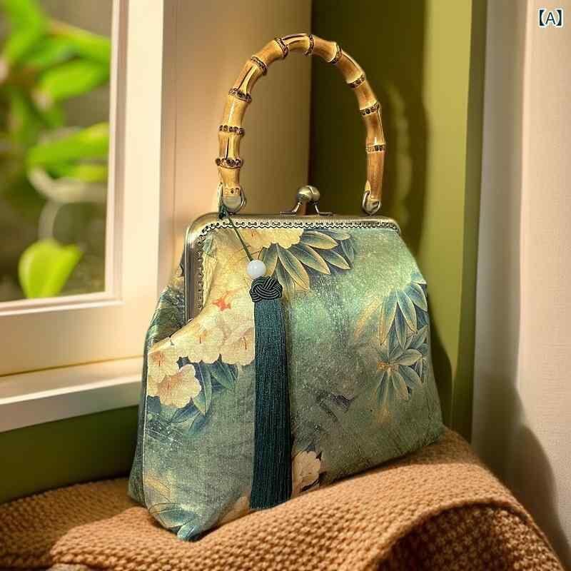 バッグ レディース がま口 手縫い ハンドメイド 竹ハンドル タッセル 織物 横型 スクエア レトロ チャイナドレス 和装 アジアンテイスト 手提げ 鞄 カジュアル 旅行 お出かけ