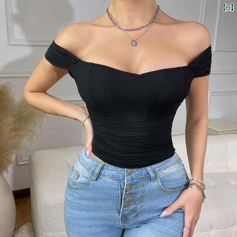トップス レディース 女性用 半袖 オフショルダー ベアトップ キャミソール 魚骨 コルセット ウエストシェイプ バックオープン 背中見せ アウター インナー 重ね着 ショート丈 スリムフィット ストレッチ 再生繊維 ノンワイヤー パッドなし 大人カジュ