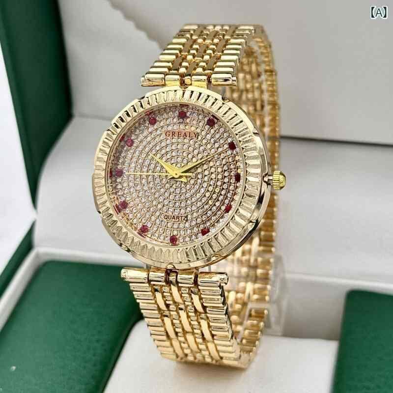 腕時計 レディース 全面ジルコニア文字盤 レッドストーン装飾 ラウンド クォーツ アナログウォッチ 合金製 ミネラルガラス風防 きれいめ ファッション エレガント 上品 高級感 大人カジュアル デイリー 女性用 ローズゴールド プレゼント