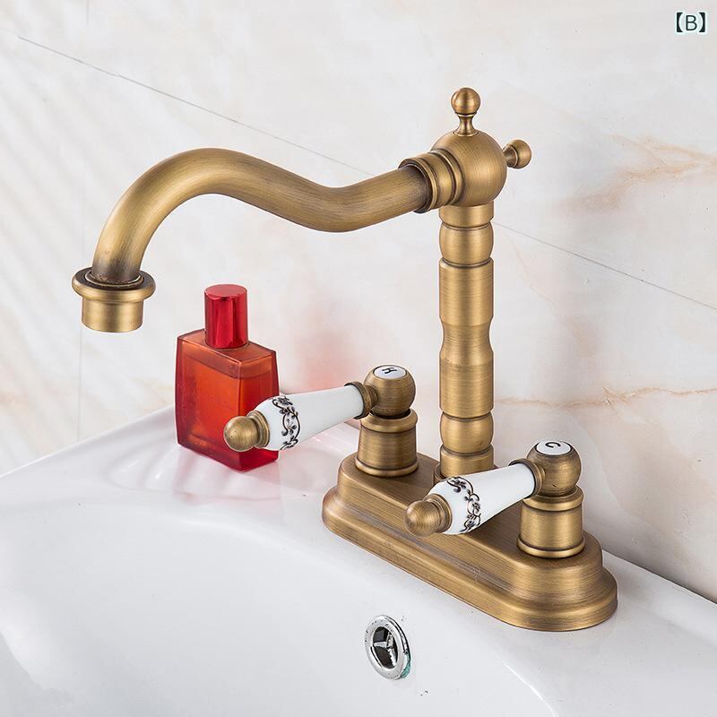 蛇口 洗面台用 アンティーク調 レトロ ヨーロピアン 全銅製 真鍮製 2穴 デッキマウント 混合栓 回転式 セラミックバルブ ブロンズ