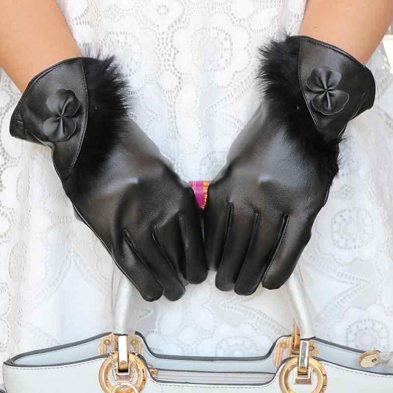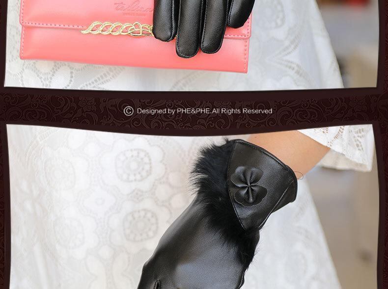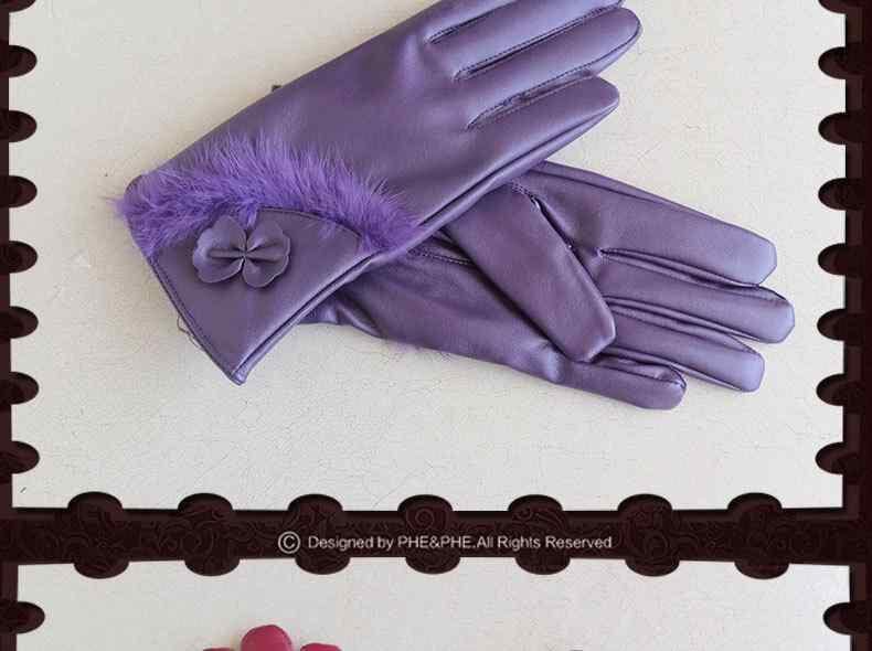 手袋 レディース スマホ対応 グローブ PUレザー 合成皮革 秋冬 防寒 防風 暖か 裏起毛 ラビットファーリボン 指あり 無地 レッド パープル ブラック