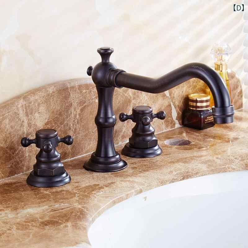 水栓金具 アンティーク調 全銅製 ブラック 洗面台 洗面所用 冷温 混合栓 2ハンドル 3点セット カウンター設置型 電気メッキ加工 高耐久 セラミックバルブ 蛇口