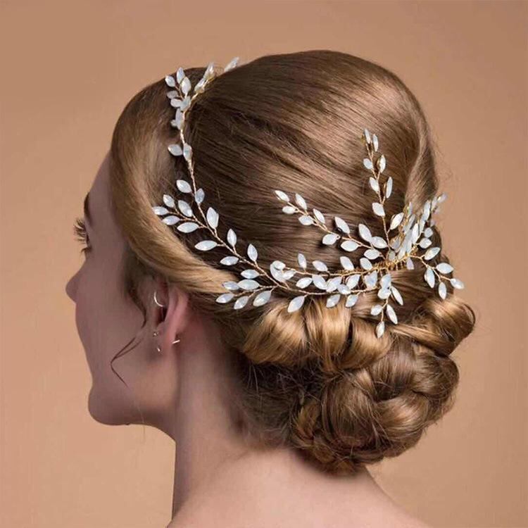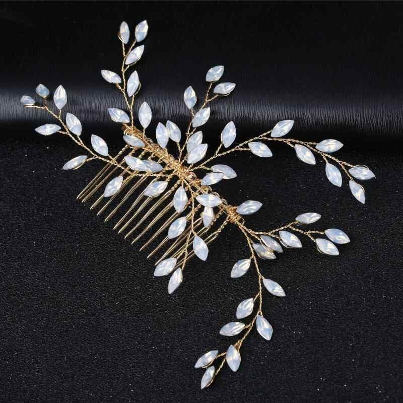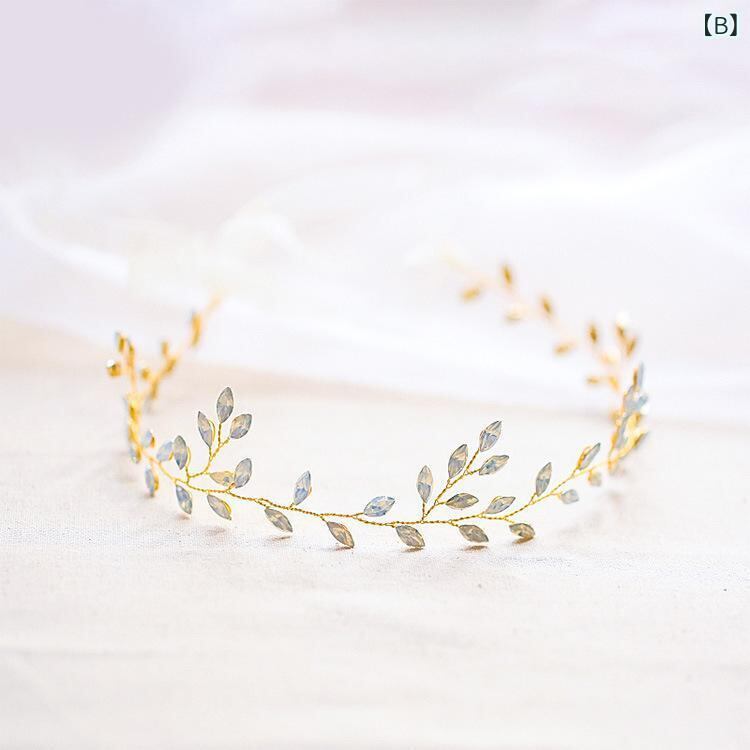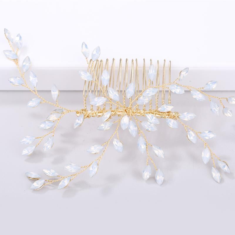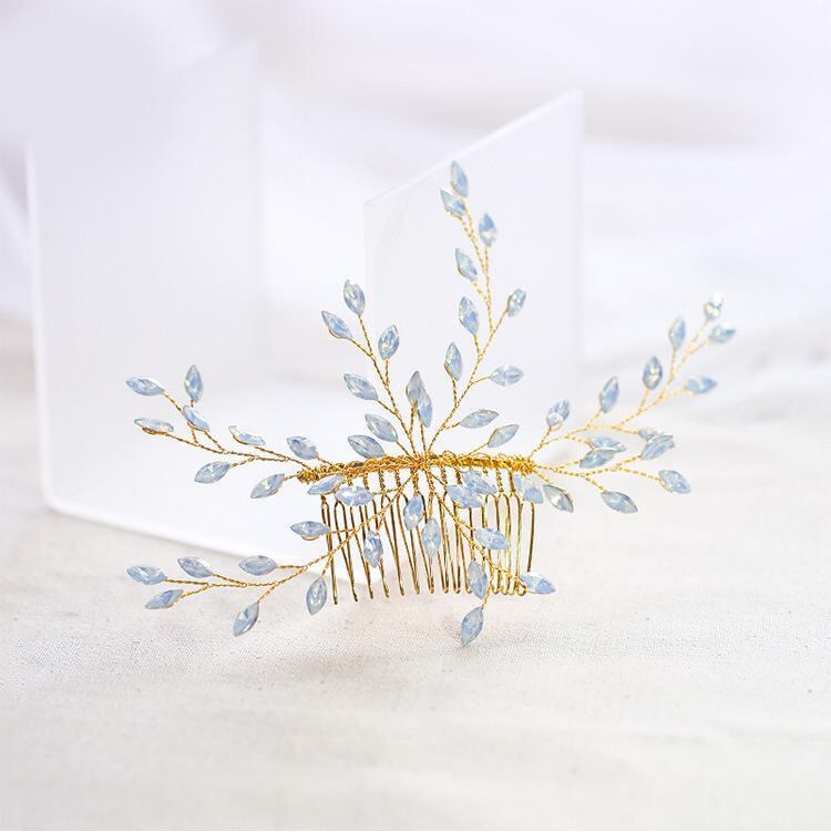 ヘッドドレス ブライダル ウェディング 結婚式 花嫁 前撮り 披露宴 パーティー 韓国風 優美 ナチュラル 高級感 ハンドメイド オパール風ストーン リーフ ゴールド ピンク ブルー ヘアコーム 髪飾り