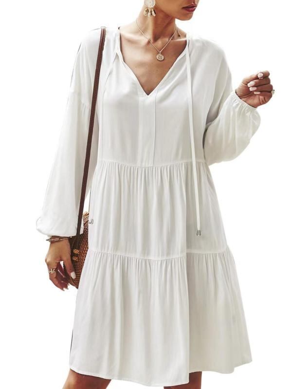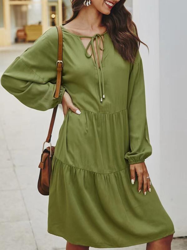 ["・柄: 無地","・加工: パッチワーク、切り替え","・組み合わせ形式: 単品","・スカートタイプ: パッチワークスカート","・ネックライン: Vネック","・袖タイプ: レギュラー袖","・袖丈: 長袖","・ウエストタイプ: ハイウエスト","・主な素材: 綿30%以下","・カラー: カーキ","・サイズ展開: S, M, L, XL, XXL","・スタイル: エレガントカジュアル、アーバン、エレガント","・カテゴリ: ワンピース","・前立て: プルオーバー"]
