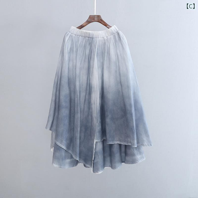 スカート レディース 女性用 春夏 綿麻 コーマ綿 手染め レトロ ナチュラル 無地 フレア アシンメトリー 二層 ロング丈 マキシ丈 Aライン リラックス カジュアル 通気性 快適