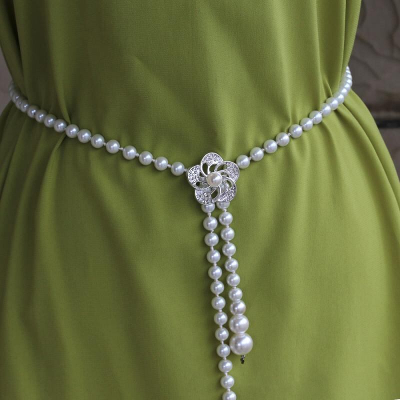 ウエストチェーン レディース パール パール フラワー 蝶々 リーフ モチーフ ウエストマーク 細見え効果 ワンピース ドレス スカート カジュアル フォーマル パーティー 上品 おしゃれ ホワイト アクセサリー