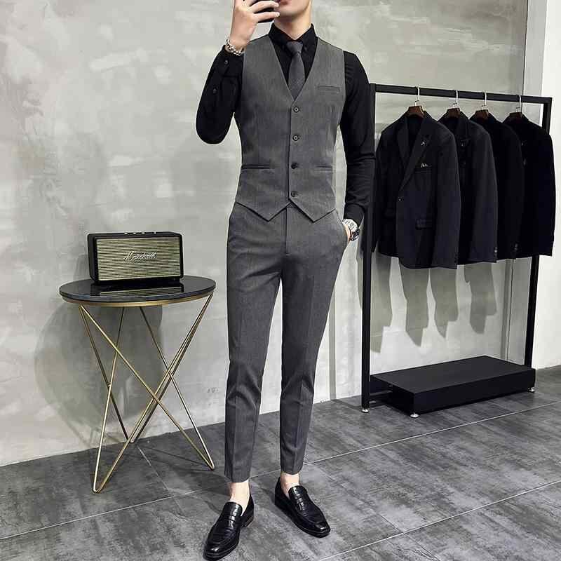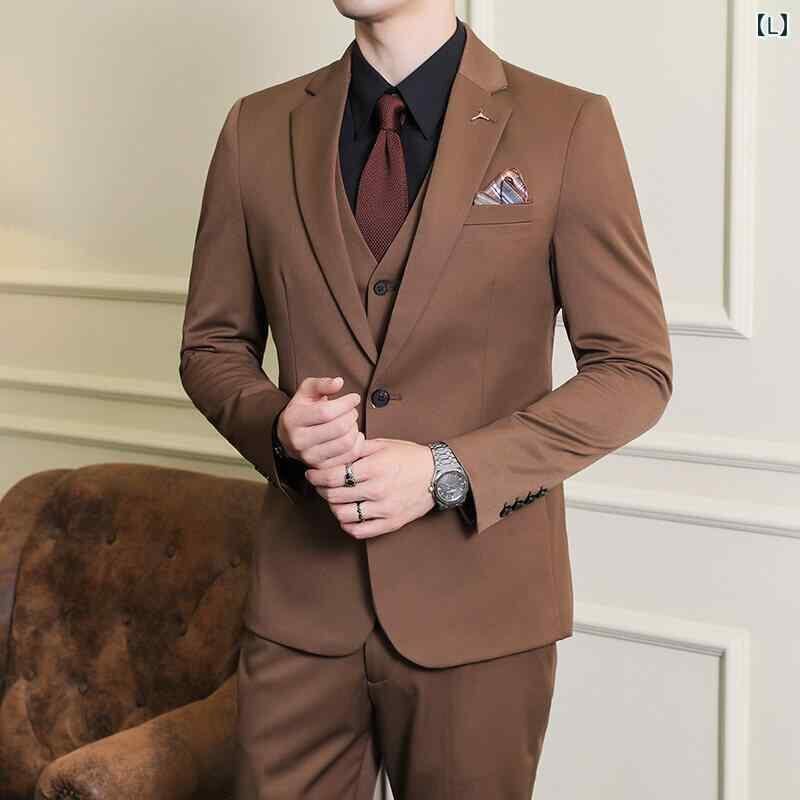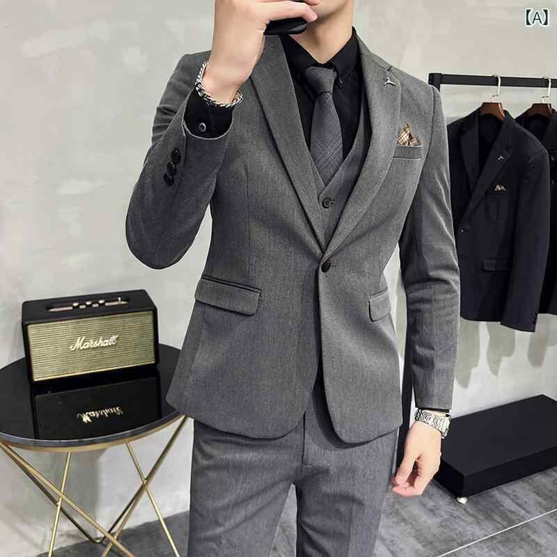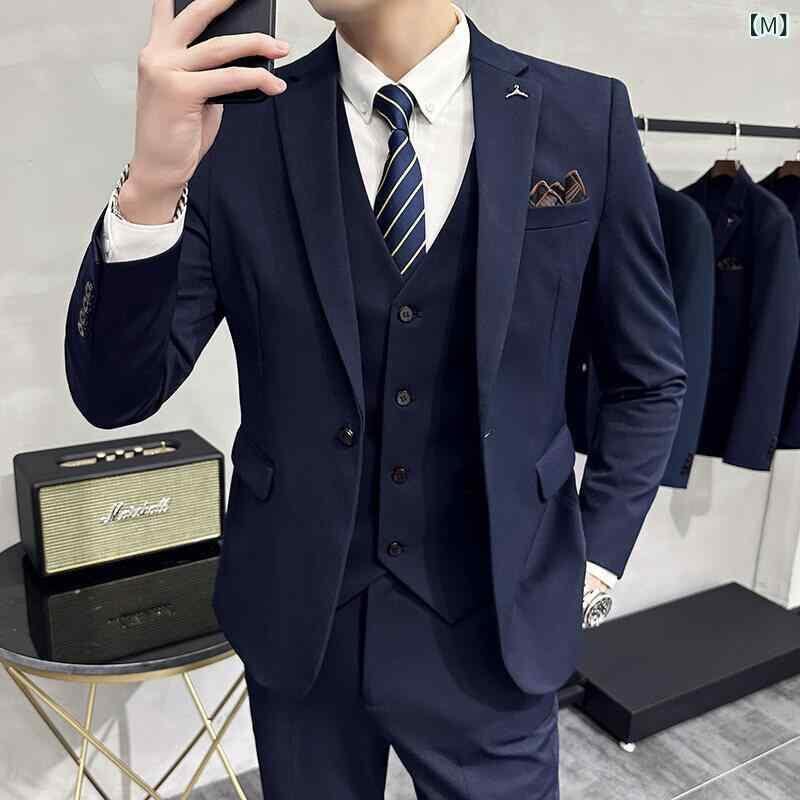 スーツ メンズ スリーピース スリムフィット カジュアル ビジネス フォーマル 結婚式 礼服 新郎 若手向け 高級感 上品 韓国スタイル 春秋 綿混 レーヨン混 グレー 黒 紺 白