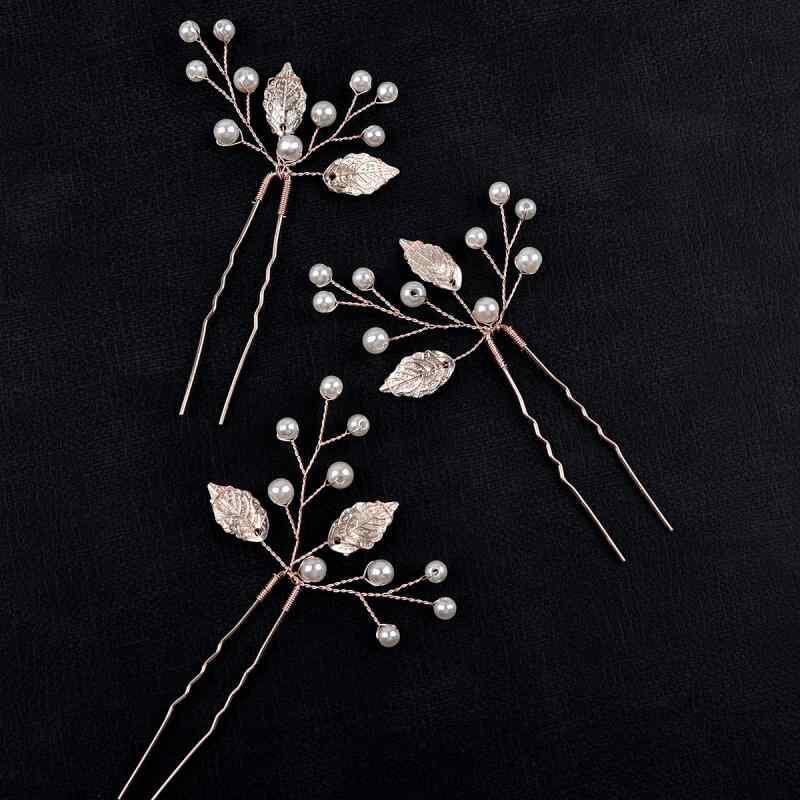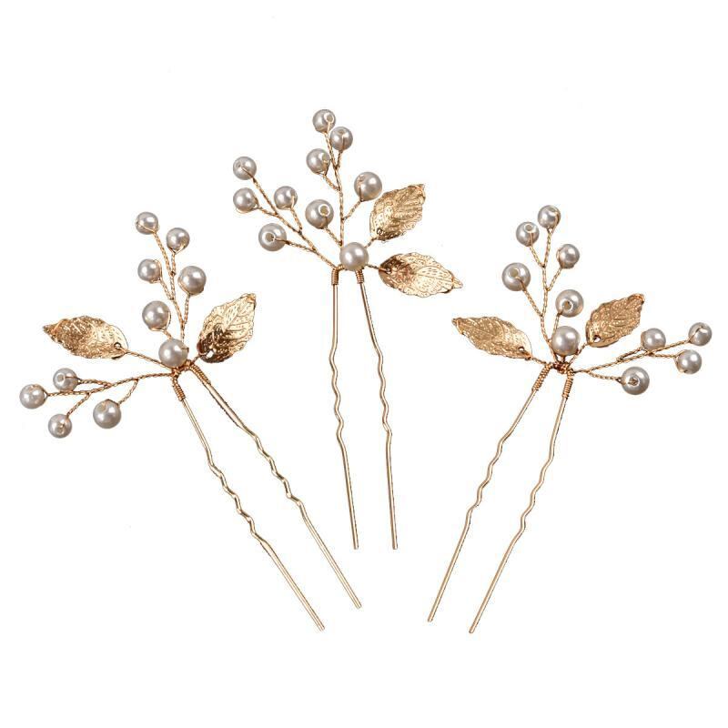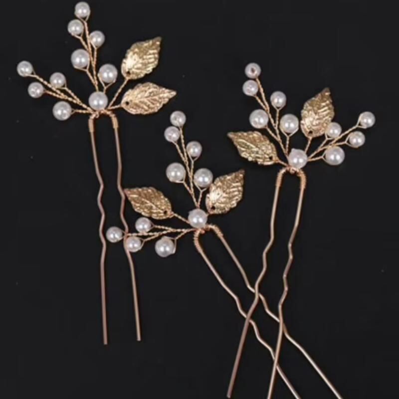 ヘアアクセサリー レディース ゴールド リーフ パール U字型 ヘアピン 3個セット ハンドメイド 髪飾り 結婚式 パーティー 和装 浴衣
