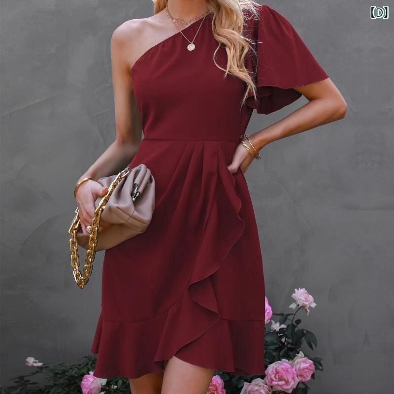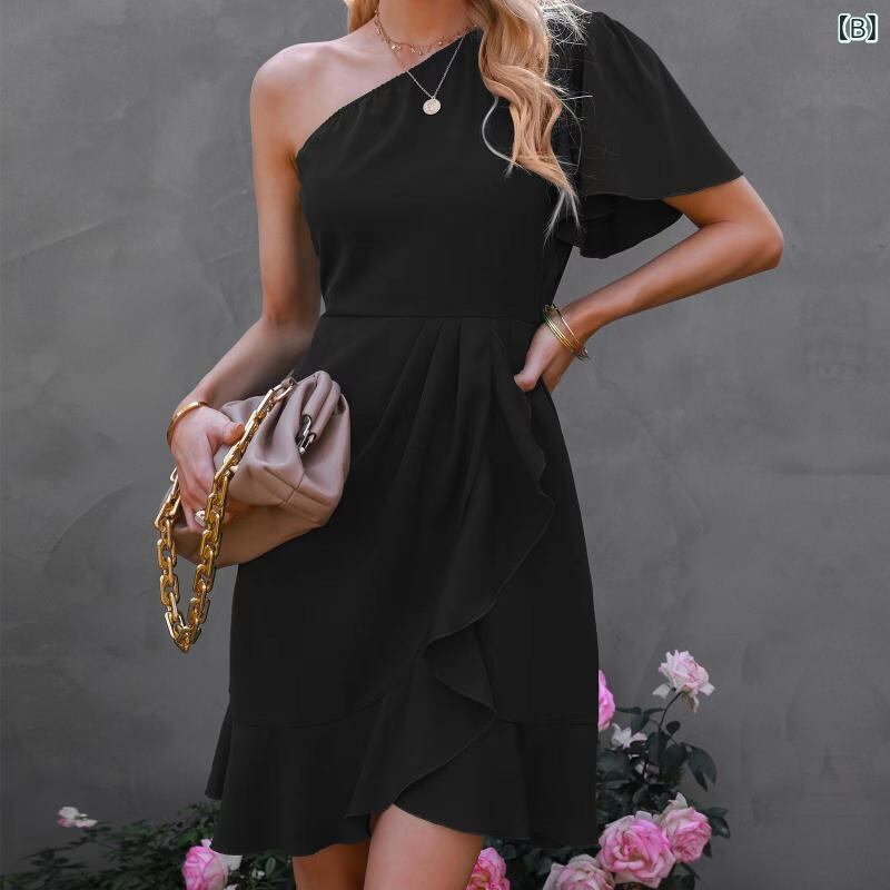 ワンピース ドレス 春夏 無地 ワンショルダー フリル ラッフル ハイウエスト ミディ丈 アシンメトリー 切り替え デザイン ポリエステル ゆったり カジュアル ストリート 欧米風 旅行 リゾート グリーン ブラック ブルー レッド