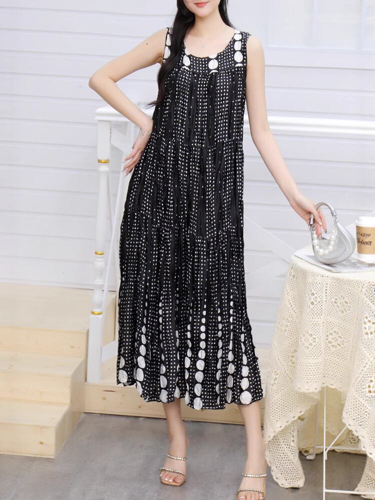 ワンピース レディース ドット柄 プリーツ レトロ ノースリーブ フレア ミモレ丈 ラウンドネック ポリエステル 上品 エレガント 通勤 オフィス 普段使い 春夏 軽やか 快適 ゆったり