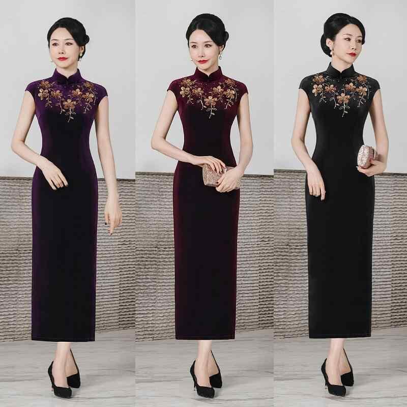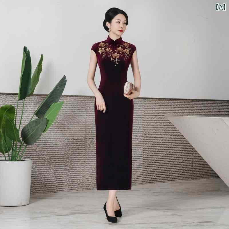 チャイナドレス レディース 春夏 ベロア 刺繍 ロング丈 大きいサイズ スタンドカラー チャイナボタン 結婚式 披露宴 パーティー フォーマル ワンピース ミセス